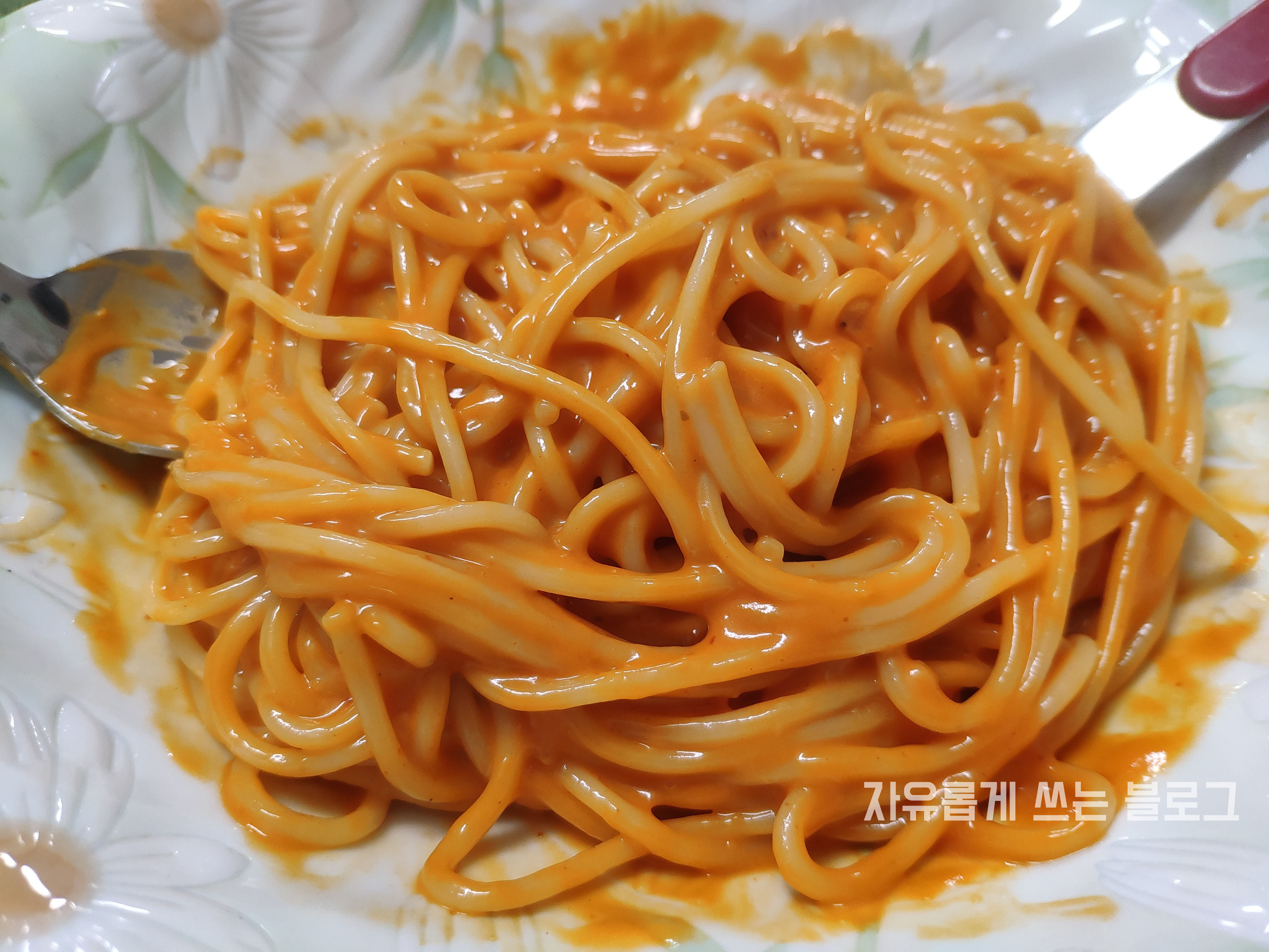 불닭 크림 파스타 소스와 스파게티면을 잘 섞어주고 나니 이런 비주얼이 됩니다.