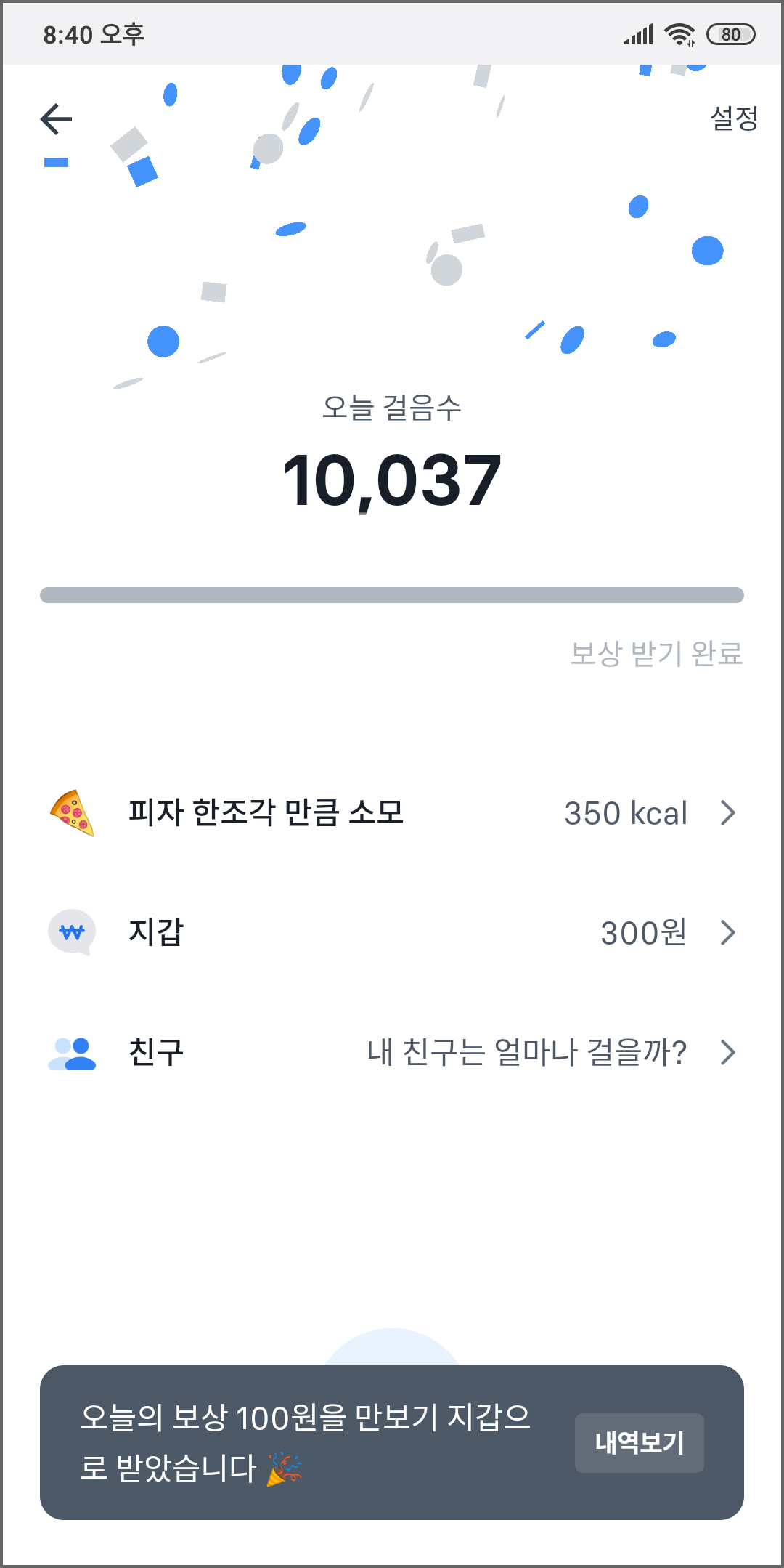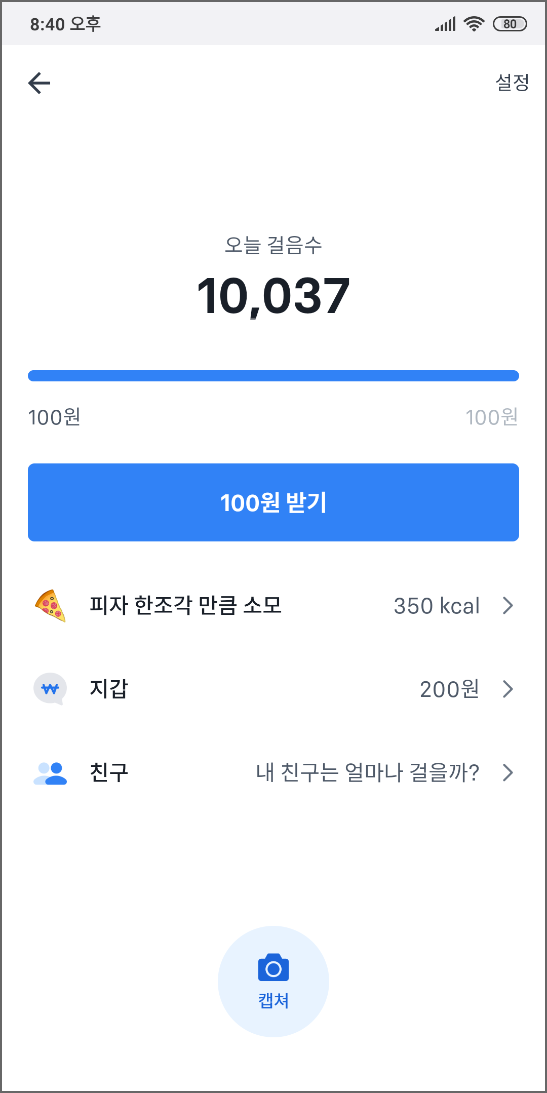 10000보 이상을 채운 뒤 '100원 받기' 버튼을 누르면