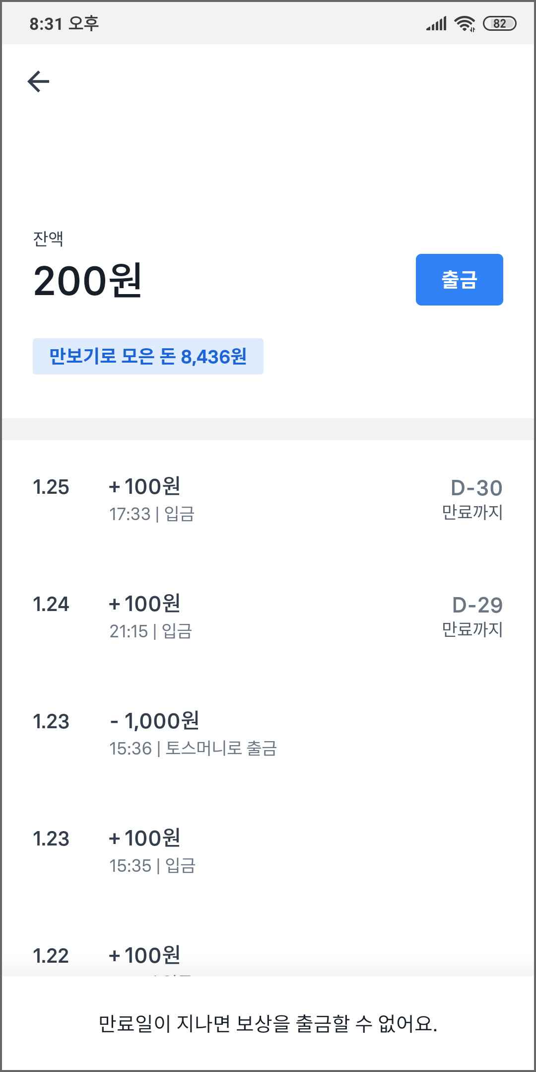 만보기 보상으로 받은 돈은 유효기간이 지나면 소멸되어 토스머니로 보낼 수가 없으니 주의하셔야 해요!