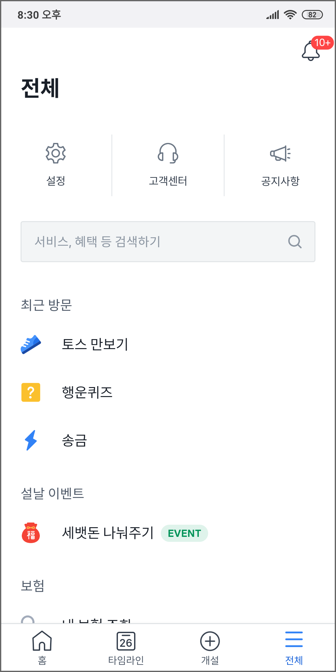 아래 사진처럼 토스 어플에서 '전체' 메뉴를 누르면 '행운퀴즈' 라는 항목이 보이는데요,