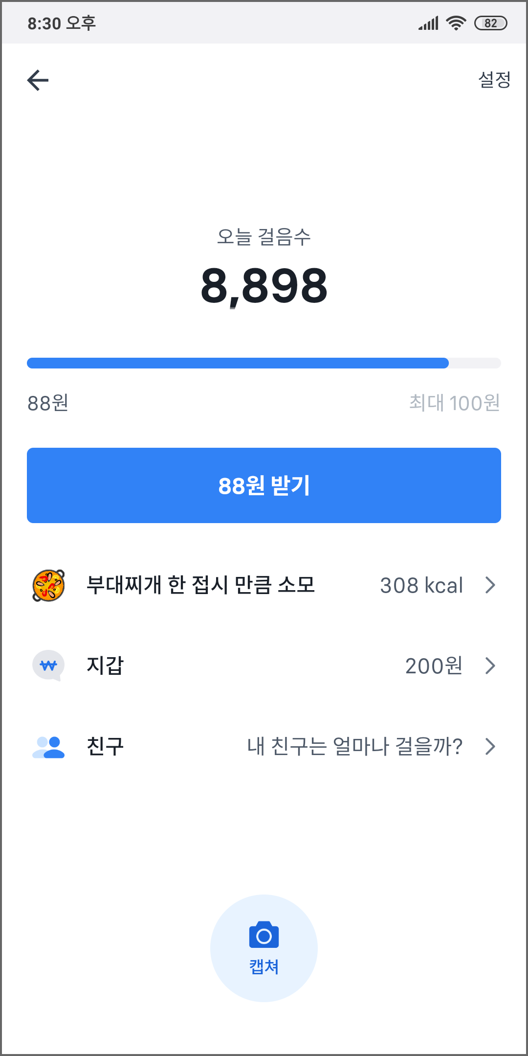 제가 그동안 만보기로 모은 돈이 얼마인지도 친절하게 알려주네요.