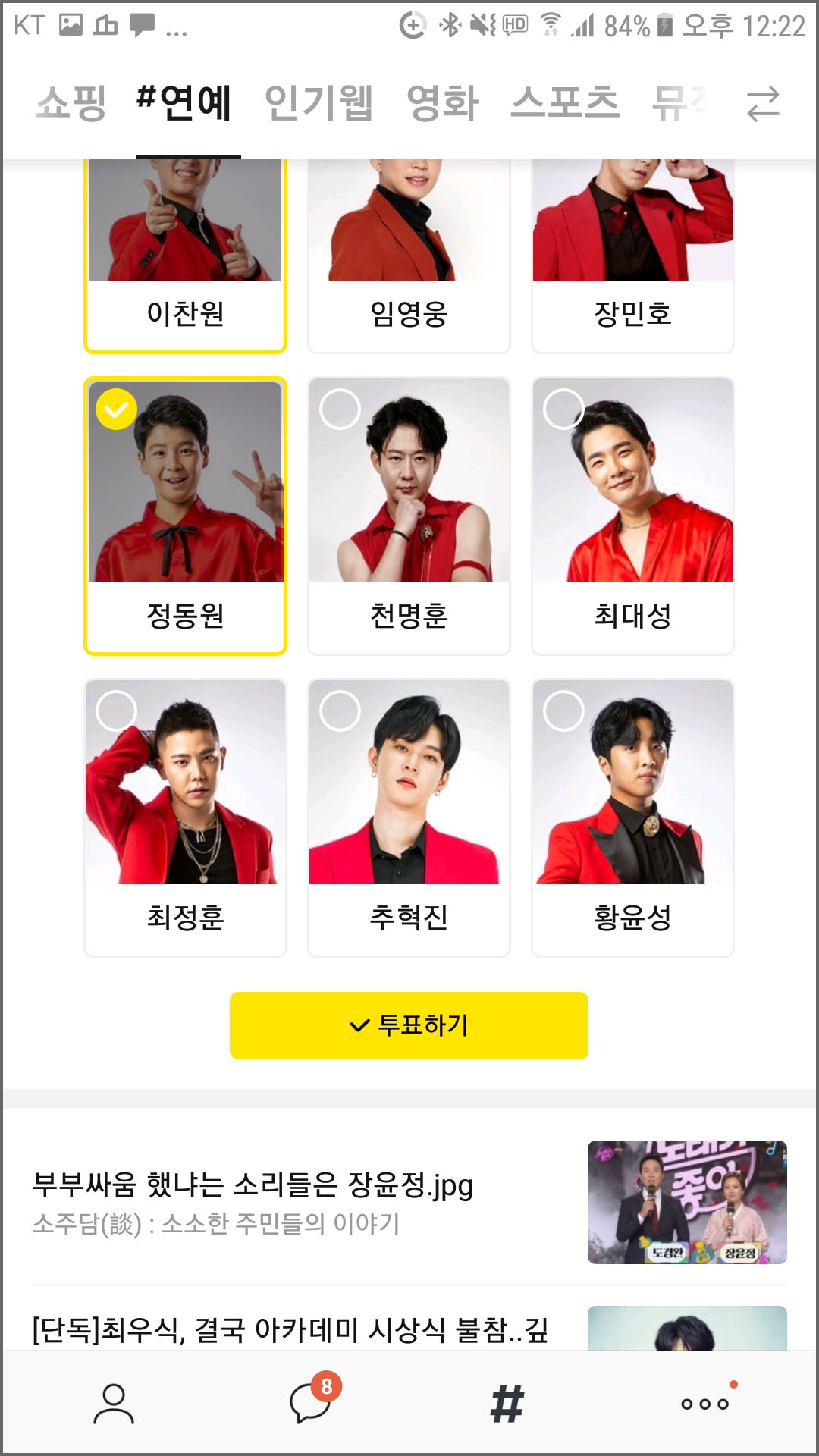 4. 후보들을 선택한 뒤, 아래로 내리면 노란색 ‘투표하기’ 버튼이 보이는데요,