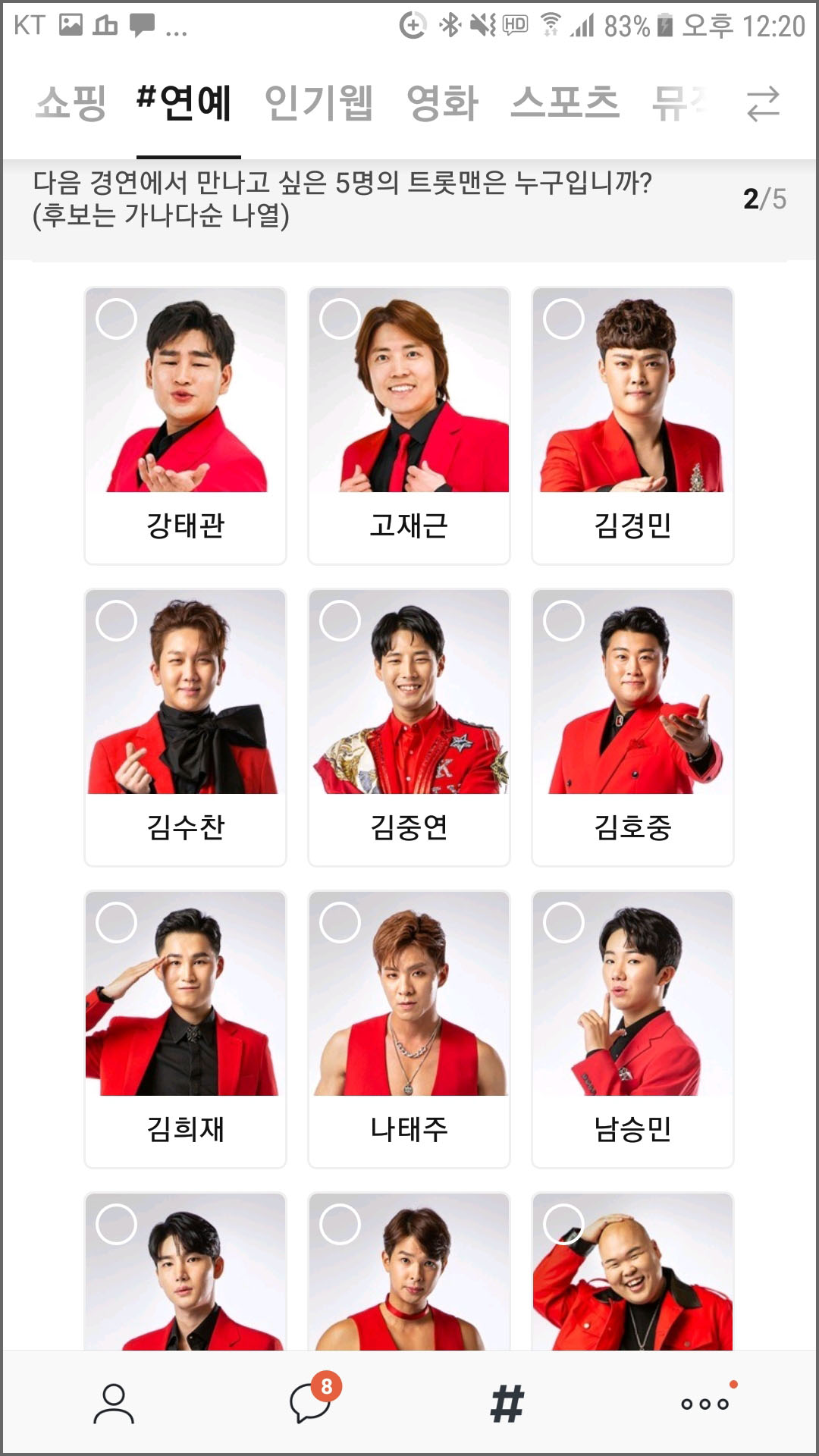 후보들이 가나다순으로 나열되어 있는데요, 이 후보들 중 응원하고 싶은 5명을 선택해줍니다.
