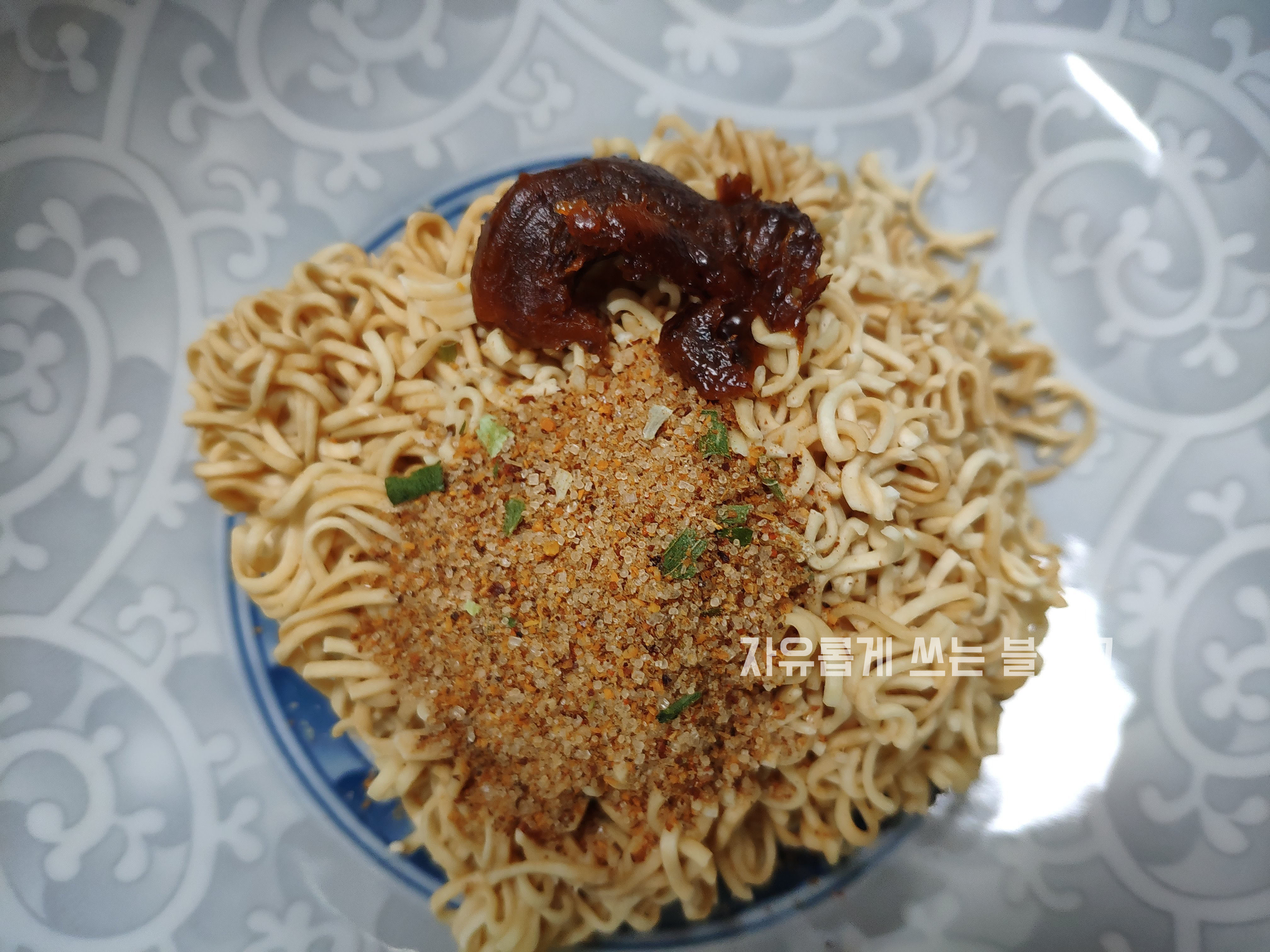 적당한 크기의 그릇에 면을 넣고, 그 위에 액상스프와 가루스프를 전부 넣어주었습니다.