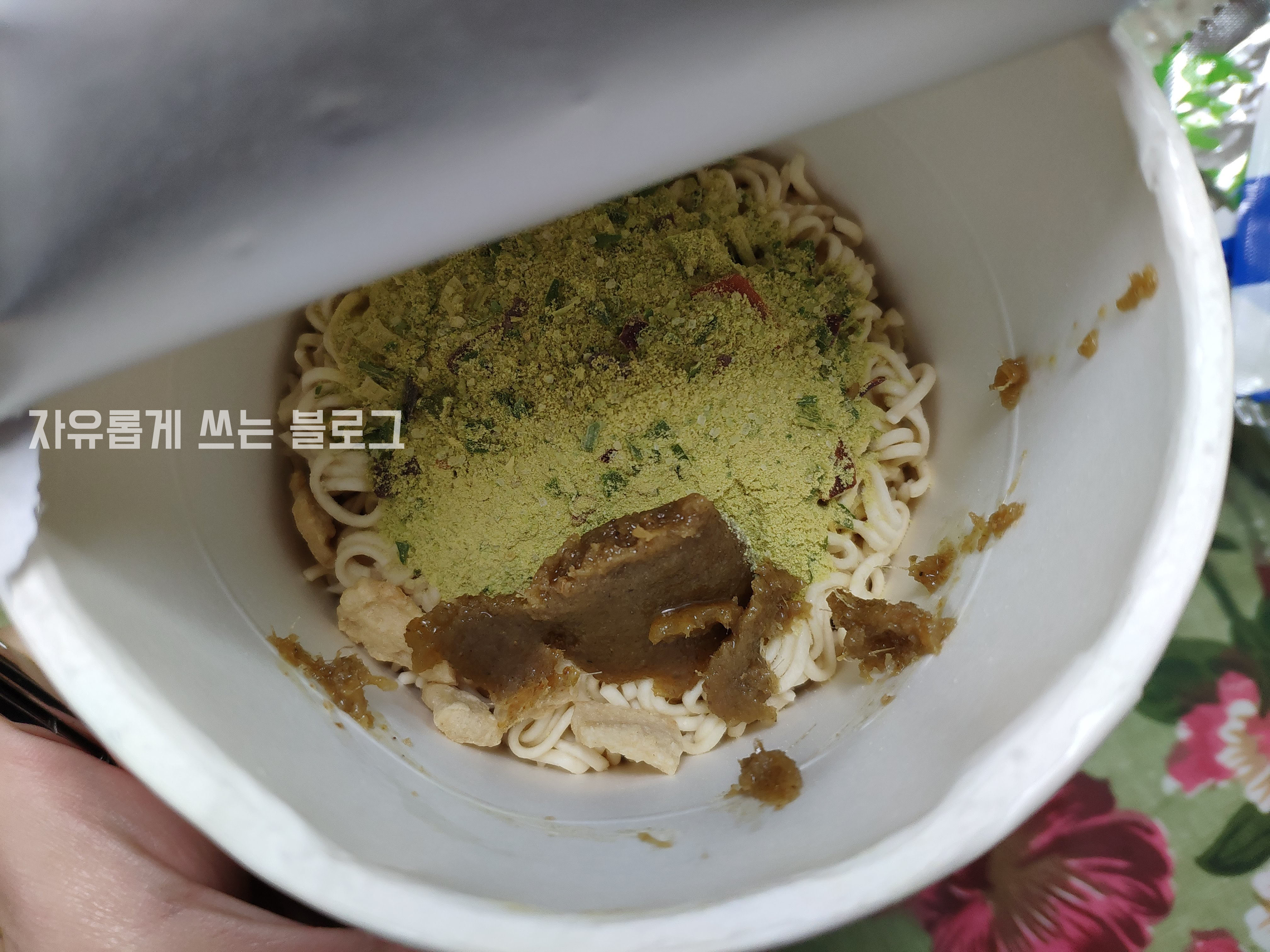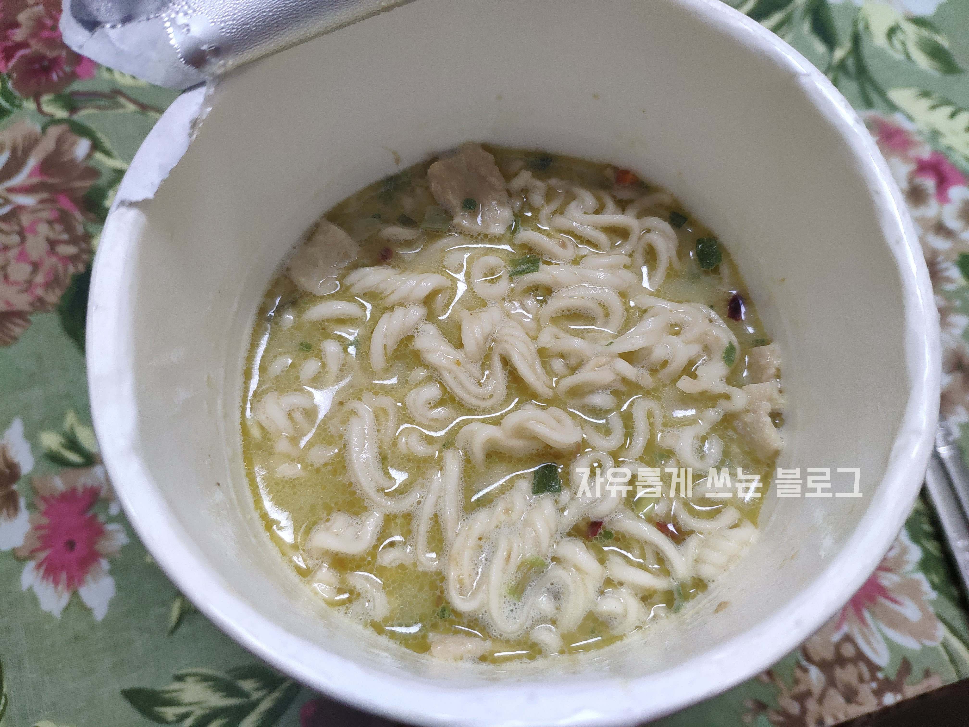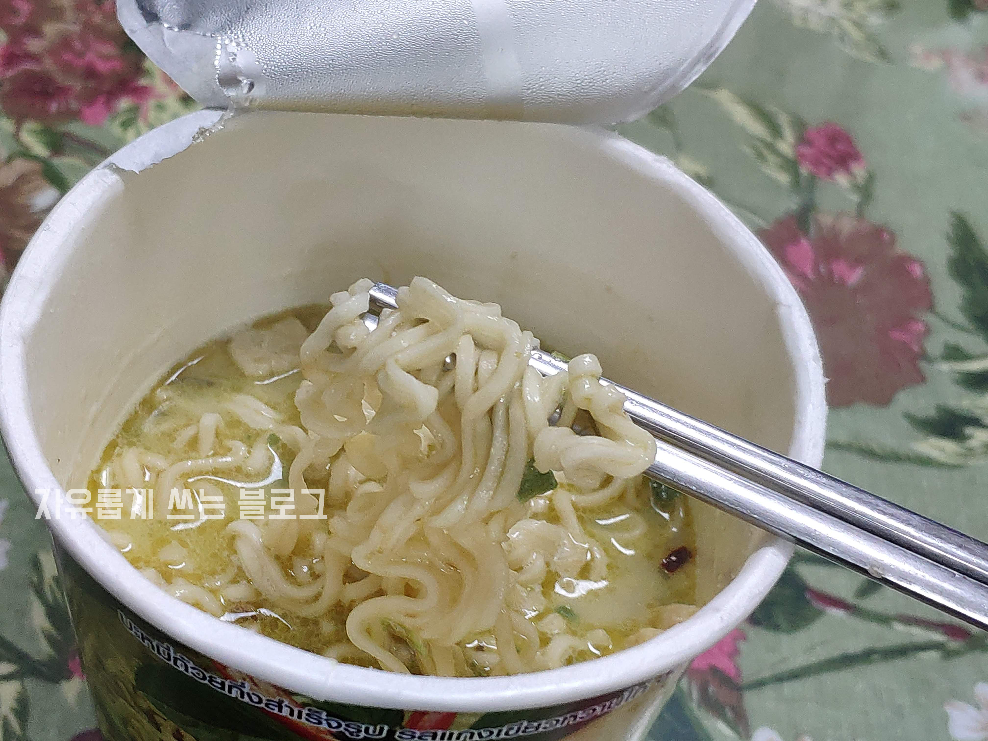 뜨거운 물을 붓고 3분간 기다려 완성된 태국 컵라면 추천 MAMA 그린커리 컵라면입니다.