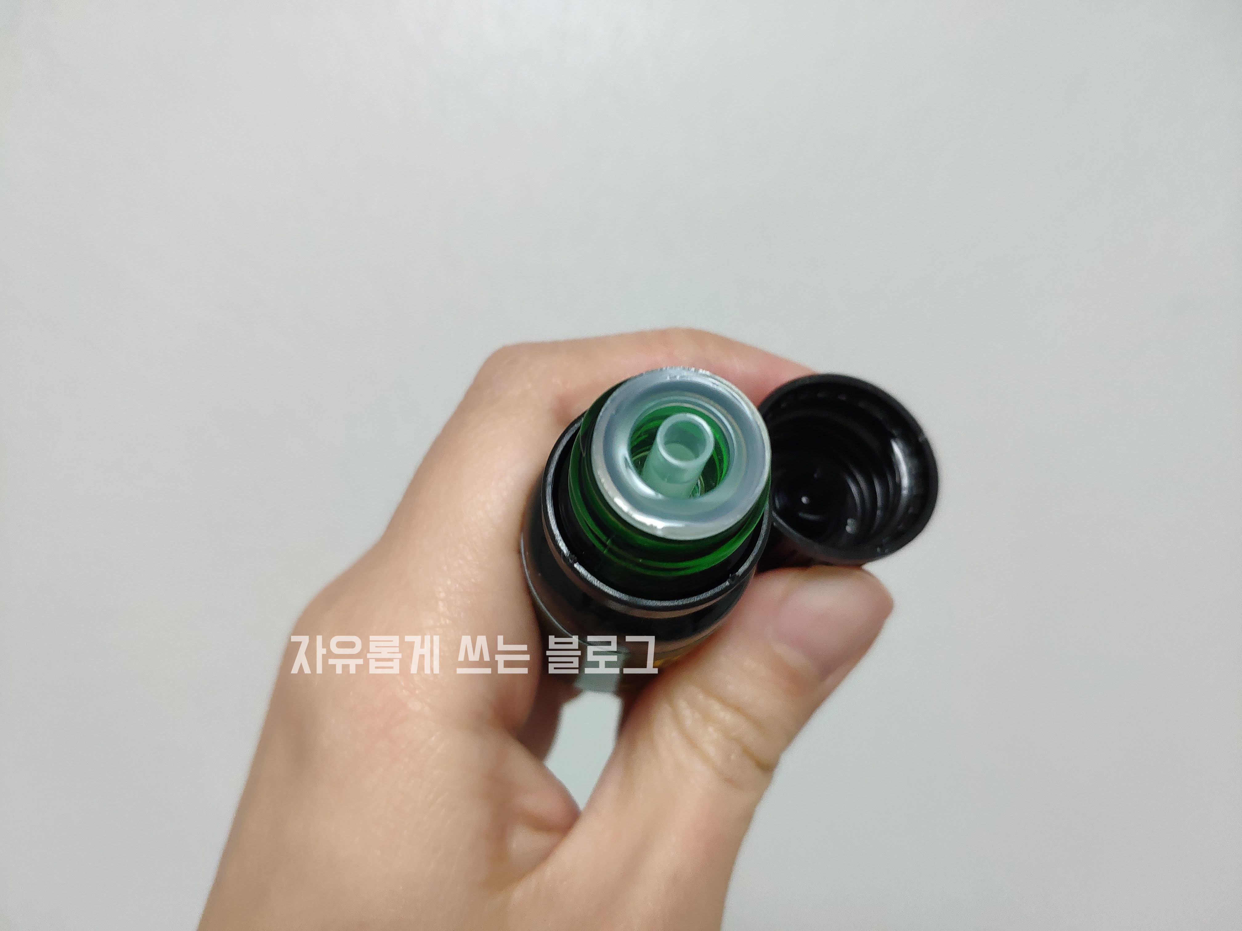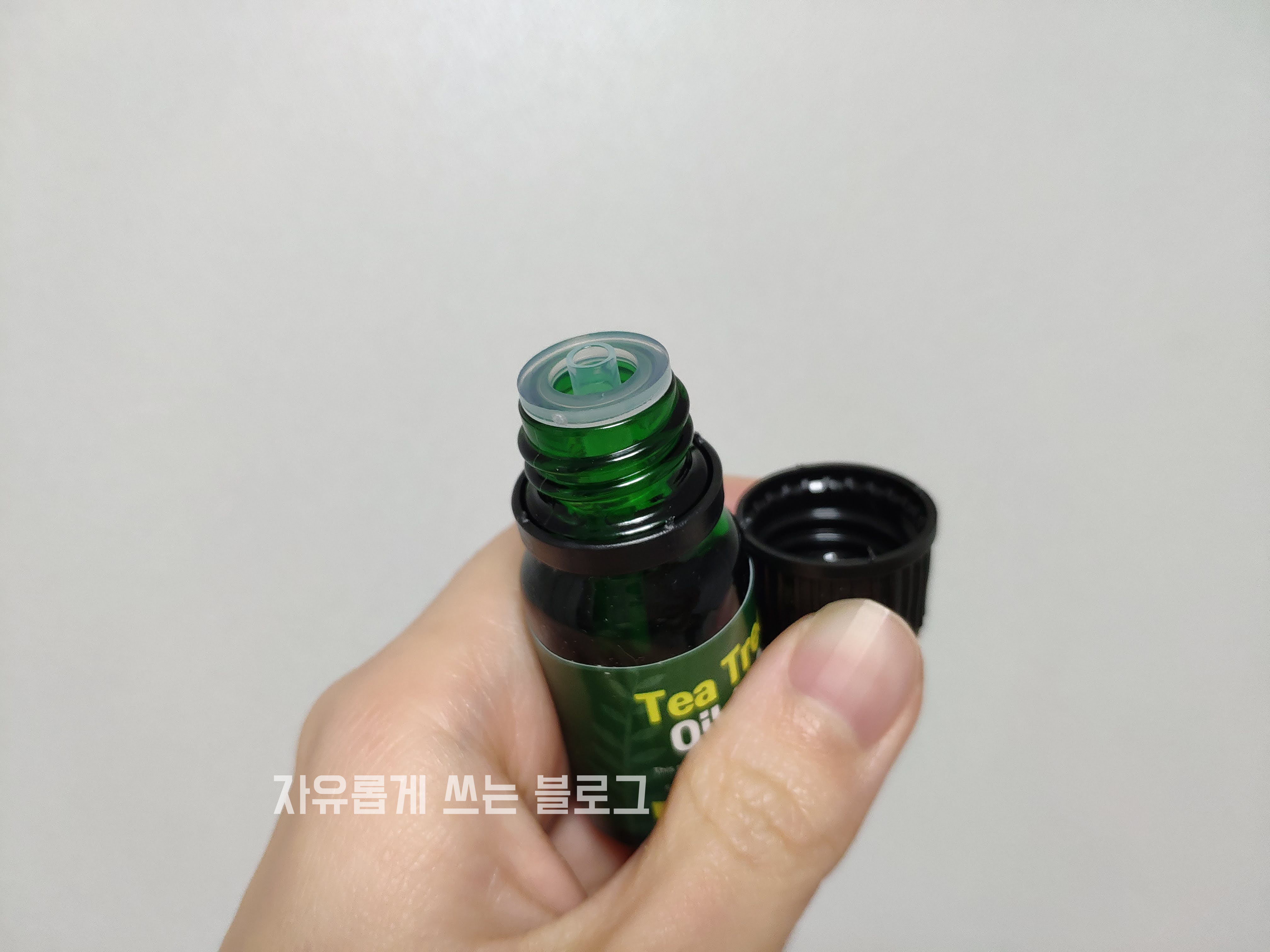 뚜껑을 열자마자 티트리 오일 특유의 상쾌한 풀냄새가 확~ 퍼집니다.