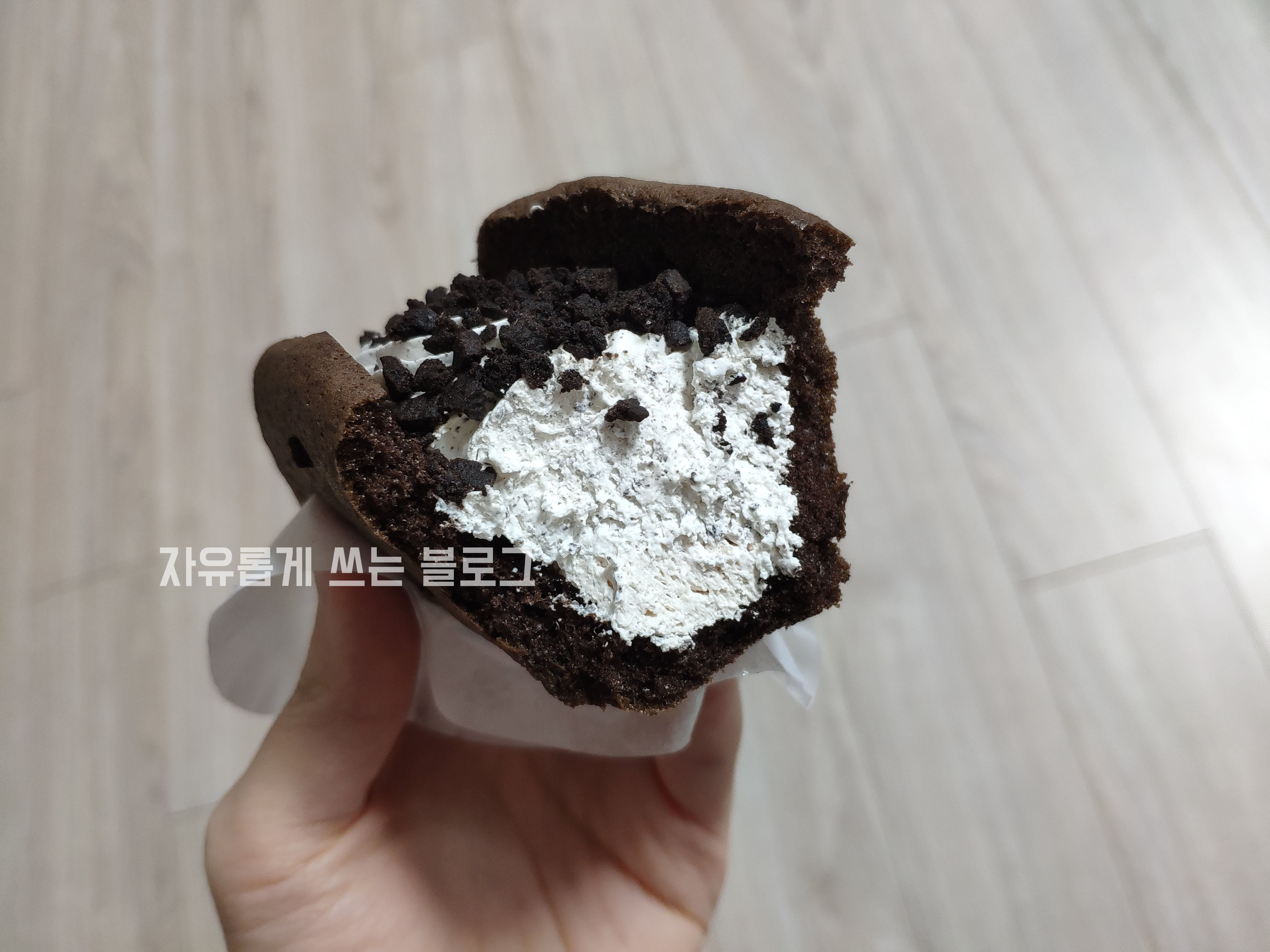 빵 안에 크림을 넣고, 그 위에 오레오 과자 부분을 뿌려 놓은 비주얼입니다. :)
