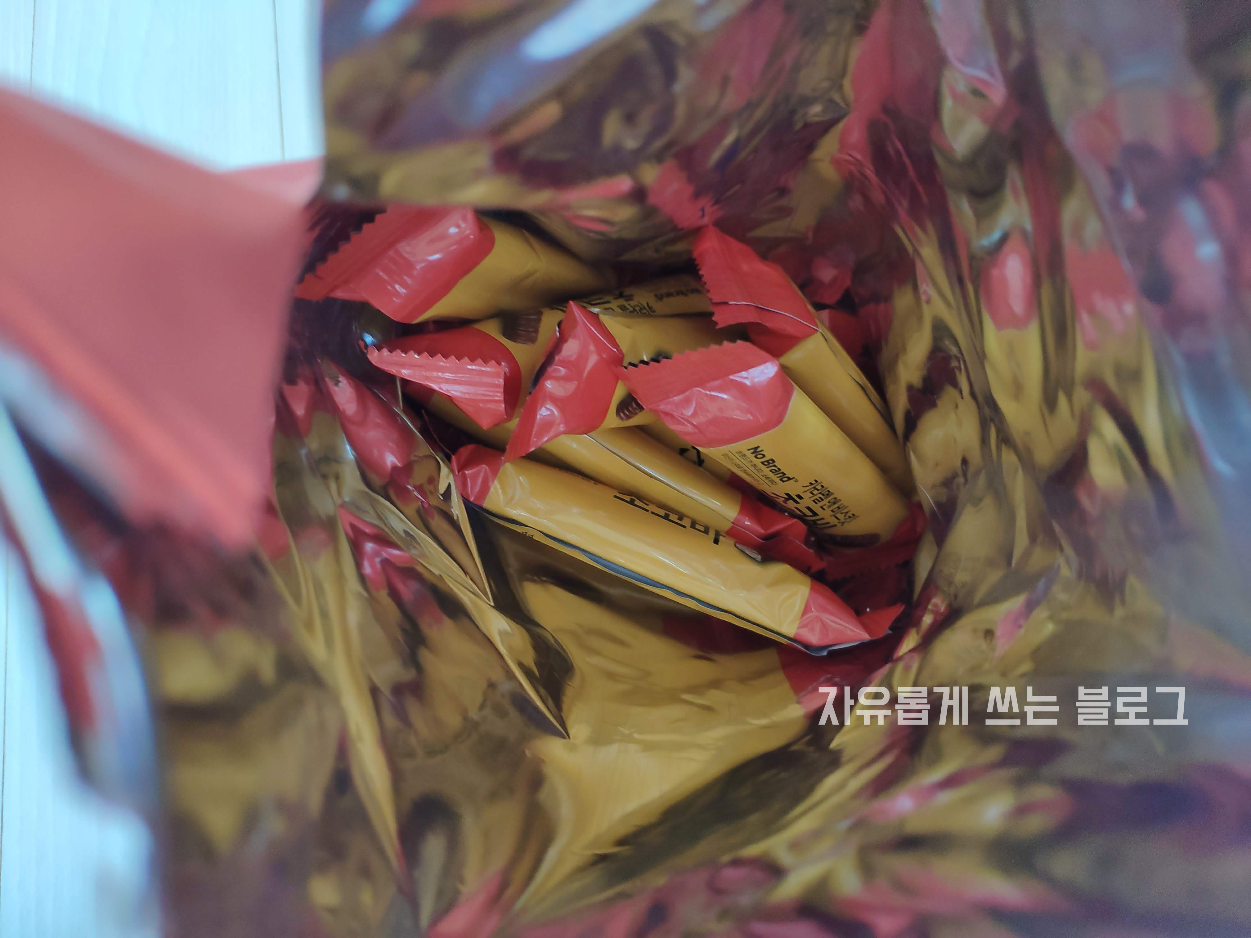 노브랜드 카라멜 앤 비스킷 초코바의 포장을 뜯어보니 낱개 포장된 초코바들이 보입니다.