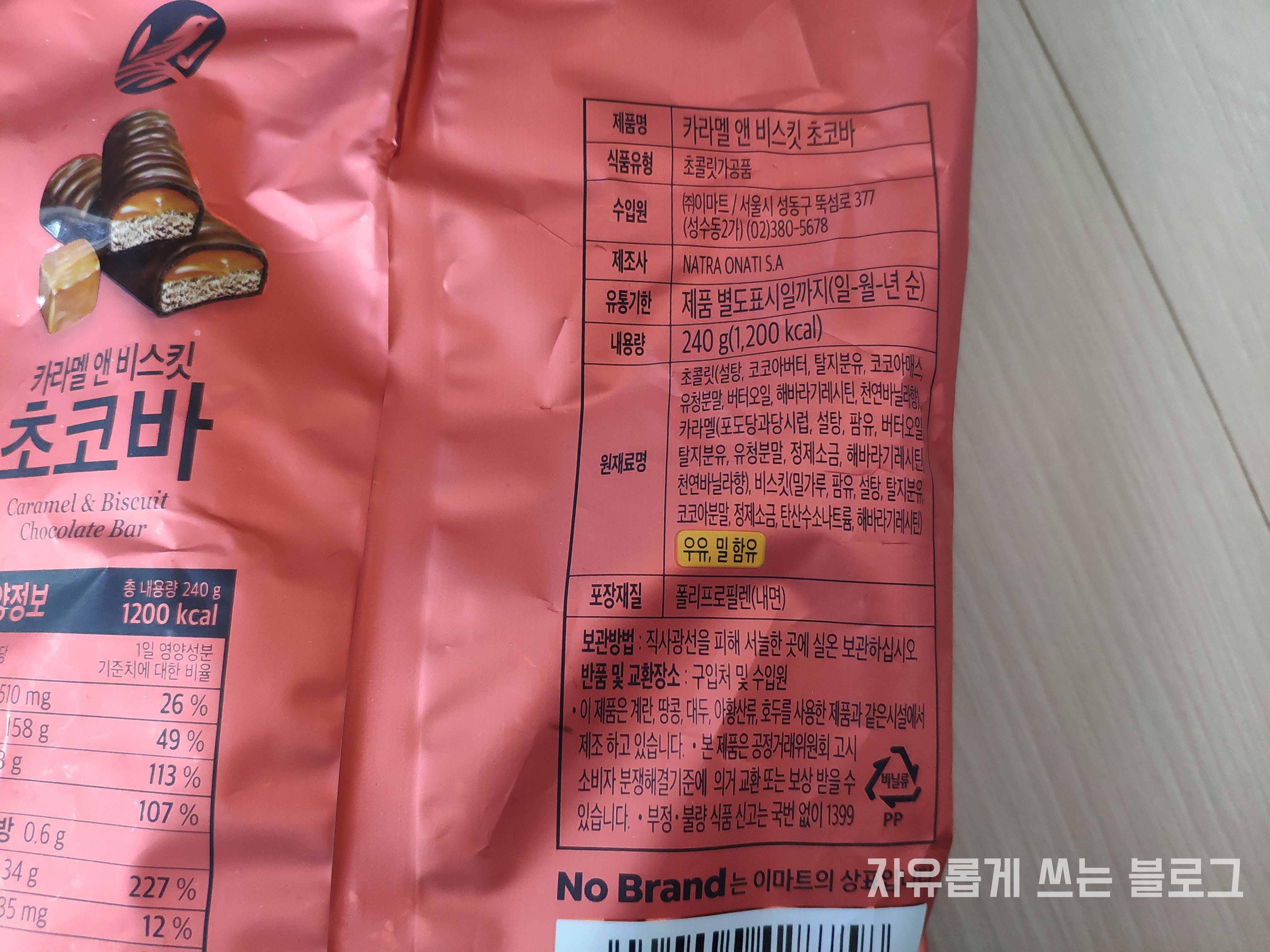 이번에는 '노브랜드 카라멜 앤 비스킷 초코바' 라는 제품을 구매해 보았는데요,