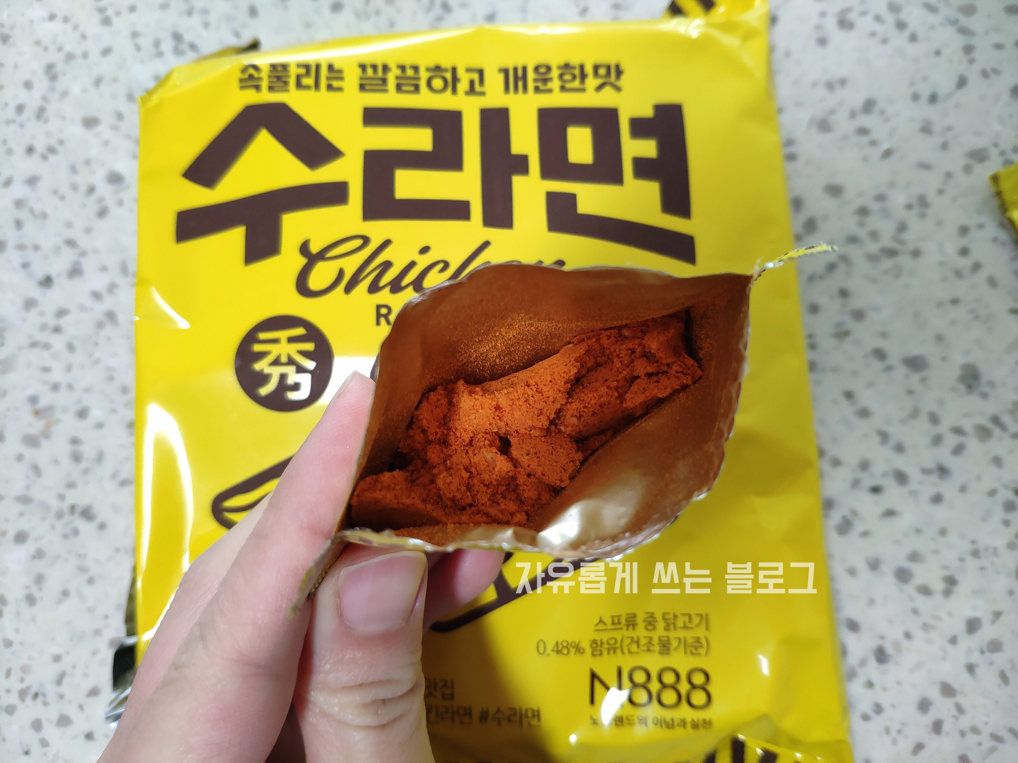 전 '치킨 라면' 이라고 되어 있길래 약간 꼬꼬면 비슷한 국물을 생각했는데, 분말스프 색을 보니 그게 아니었네요.ㅋㅋ