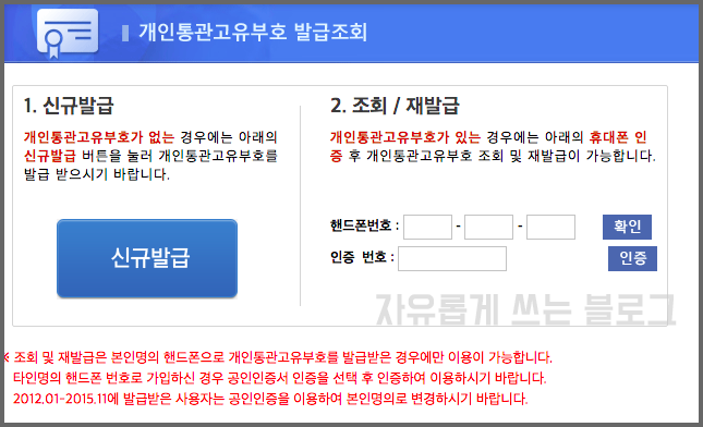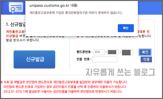 ▼전 꽤 오래전에 발급을 받았었는데, 핸드폰 번호를 입력하고 ‘확인’을 누르니 아래와 같은 메세지가 뜨더라구요.