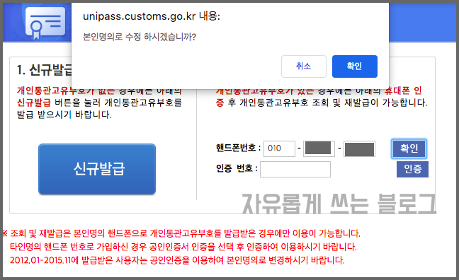 => 개인통관고유부호 조회 시 기존에 타인명의 핸드폰 번호로 가입을 한 경우라면,