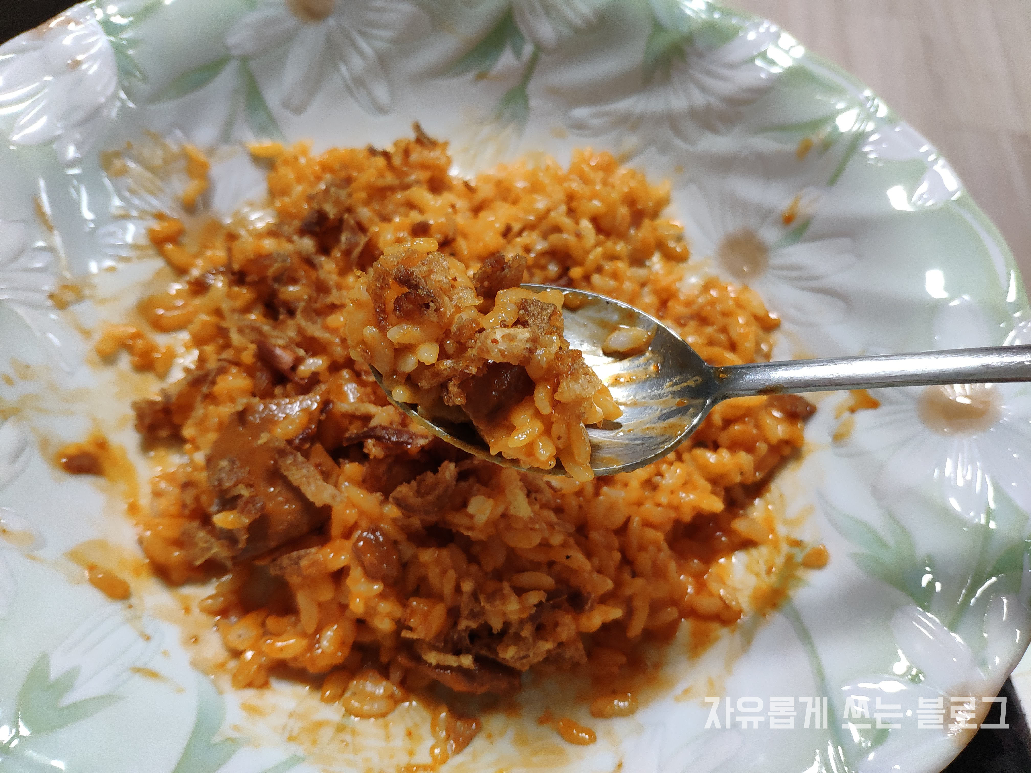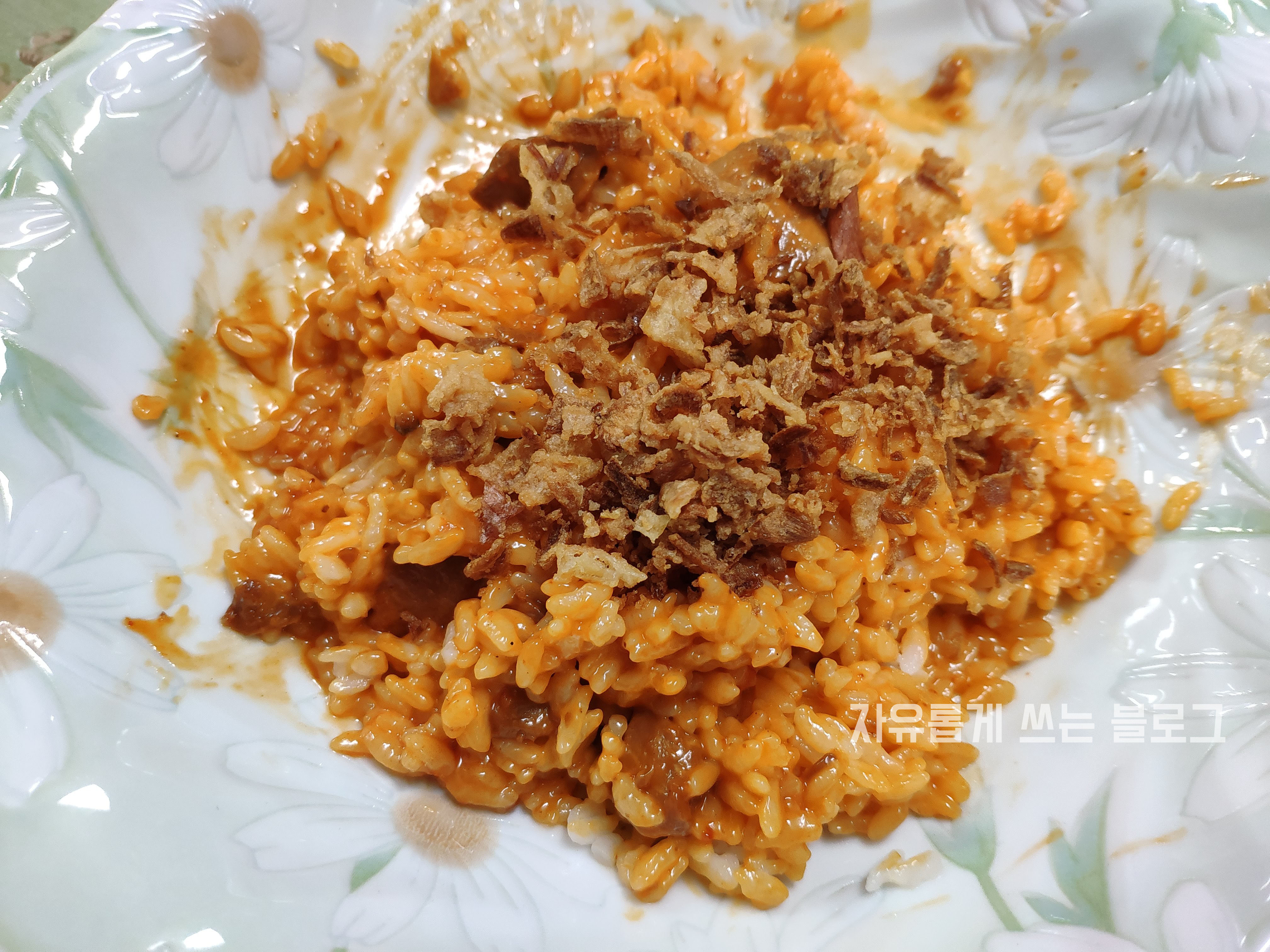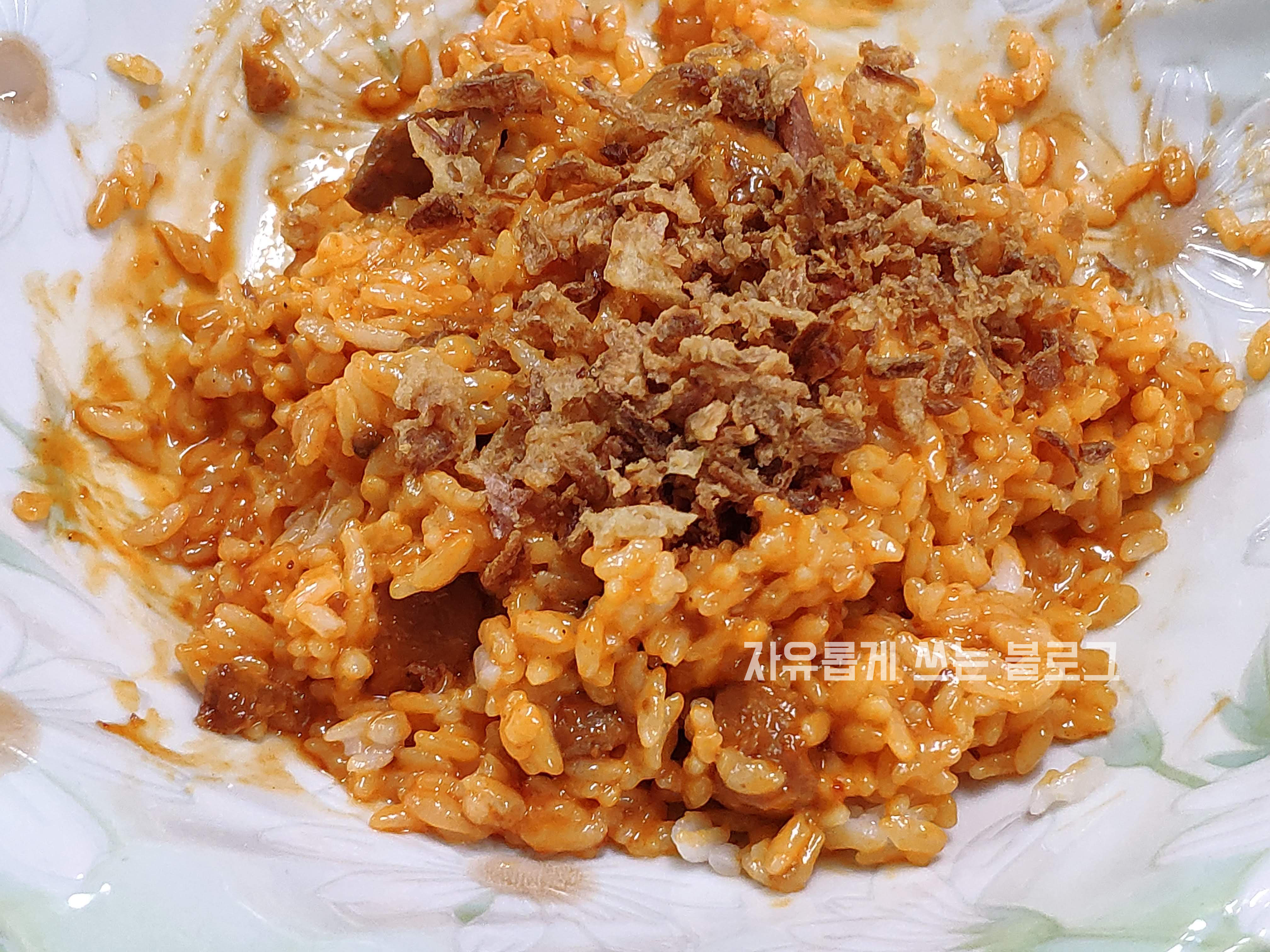 잘 섞은 뒤, 크리스피 어니언까지 뿌려준 모습!
