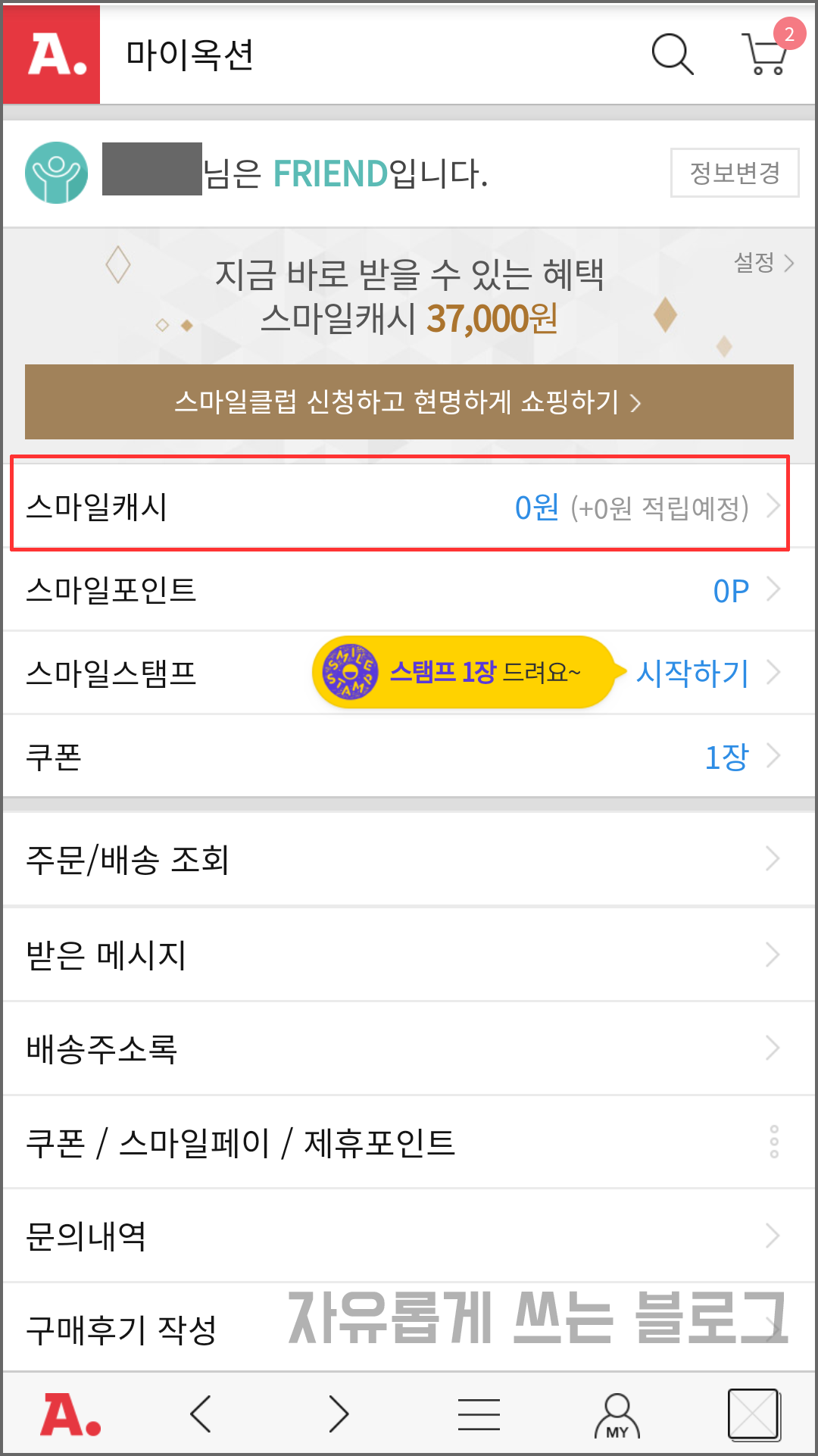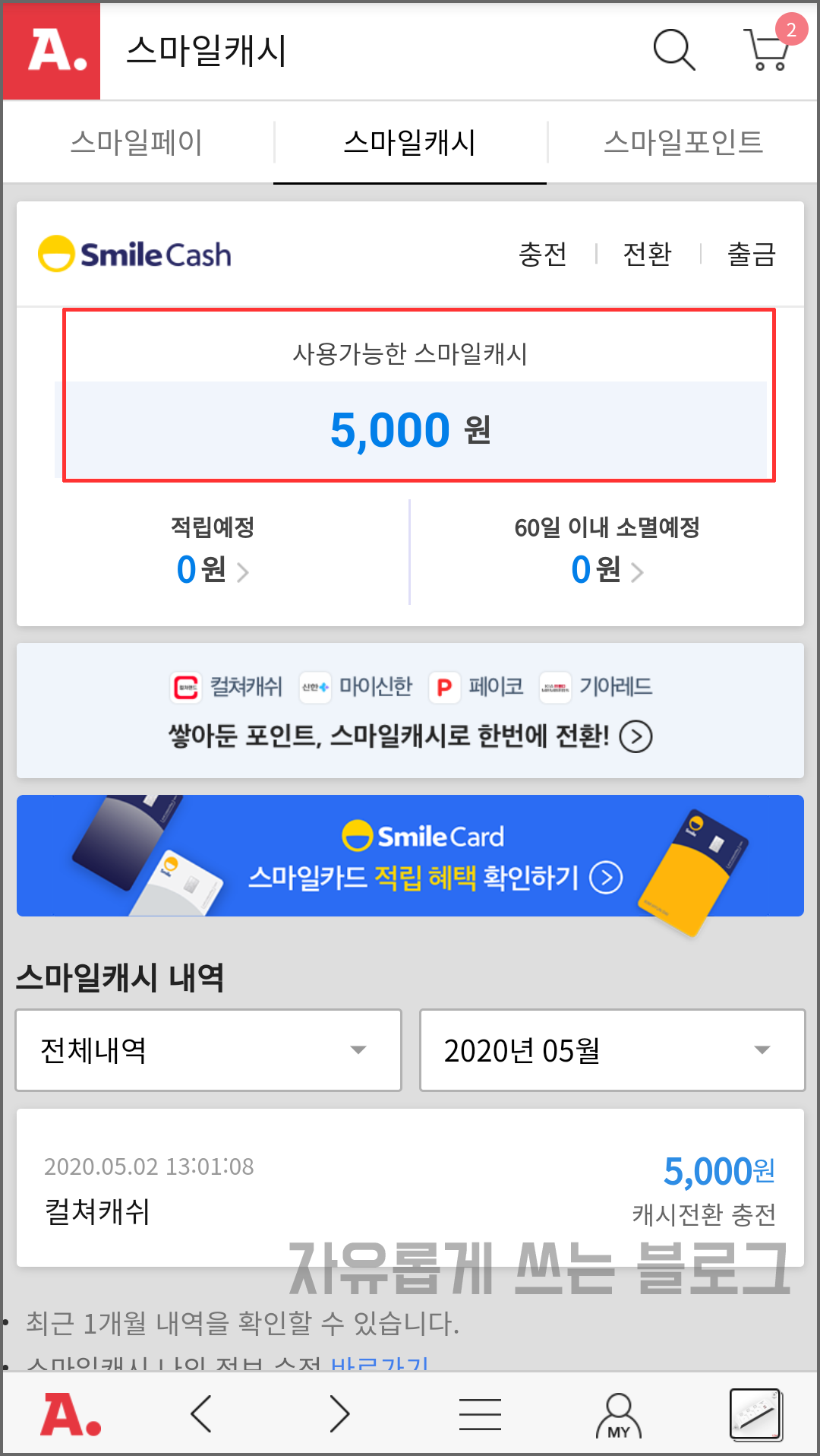 마이페이지에서 다시 확인해보니, 이렇게 사용가능한 스마일캐시에 5,000원이라고 되어 있네요.