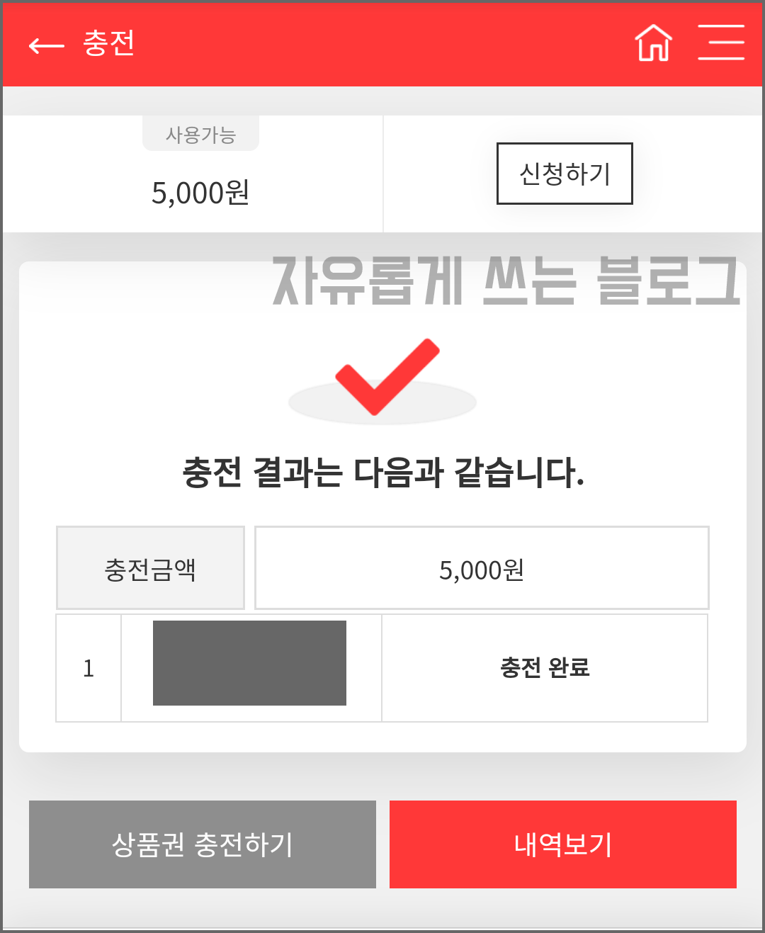 전 5,000원짜리 1장을 입력했고 바로 이렇게 충전 금액과 함께