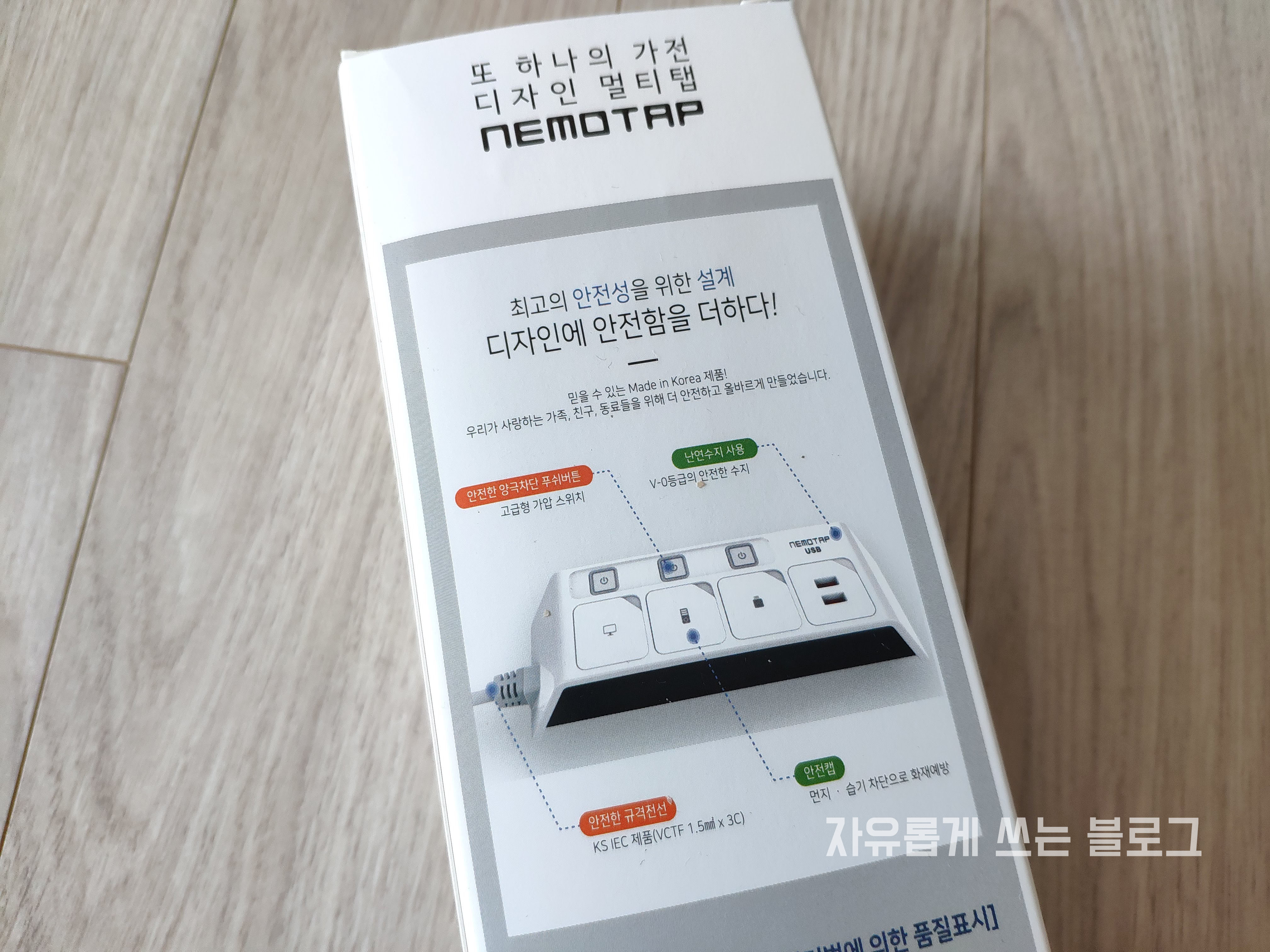 박스 뒷면에는 네모탭 3구 멀티탭에 대한 설명이 나와 있어요.