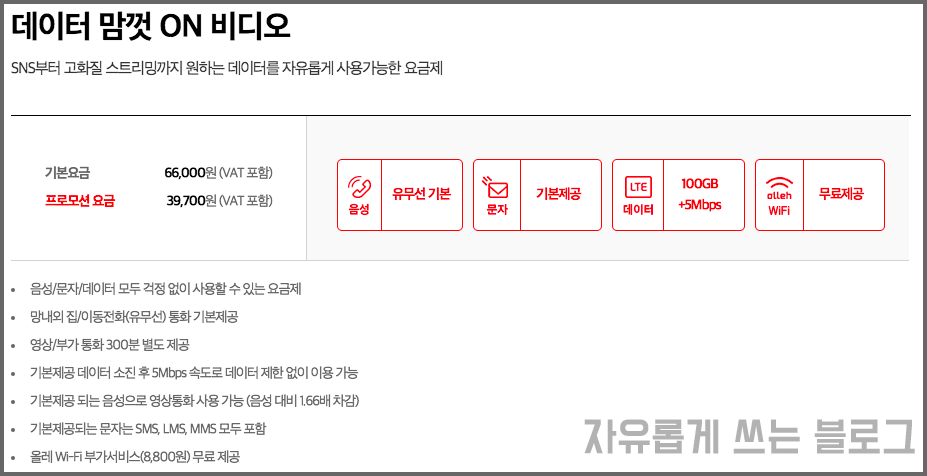 프로모션 요금으로 월 39,700원에 이용할 수 있는 요금제로,