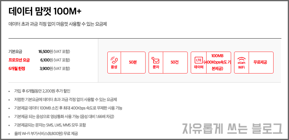 6개월 동안은 2,200원 추가 할인을 받아 월 요금 3,900원에 이용할 수 있는 요금제입니다.