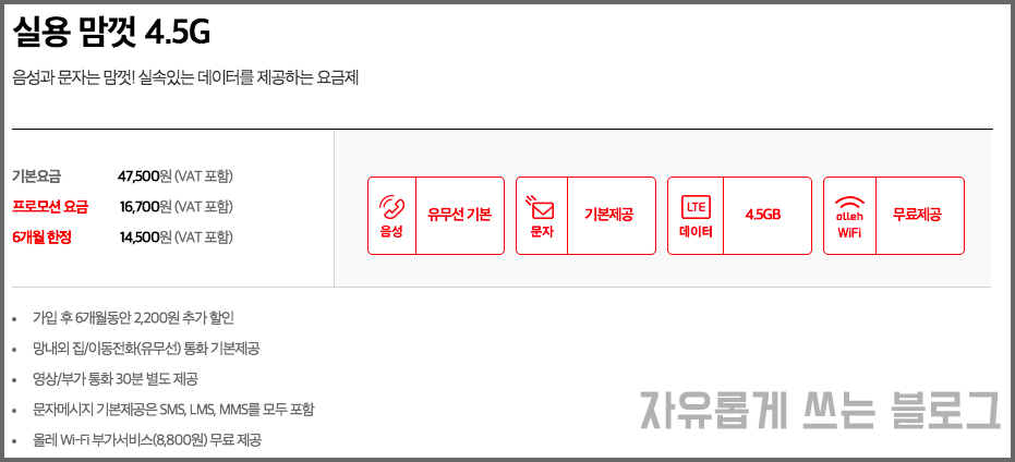 음성, 문자는 기본제공으로 마음껏 이용할 수 있으며, 데이터는 4,5GB 제공됩니다.