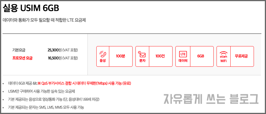 실용 USIM 6GB의 경우 프로모션 월 요금 16,500원에,