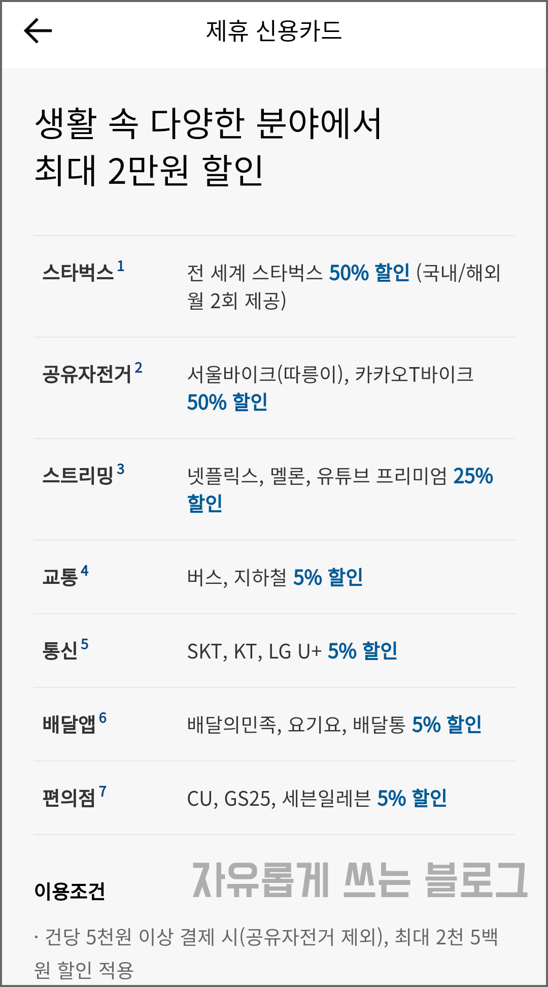 전월 실적 100만원 이상의 경우 월 통합 할인한도 5만원 범위(분류당 월 5회) 에서 할인 적용이 된다고 해요.