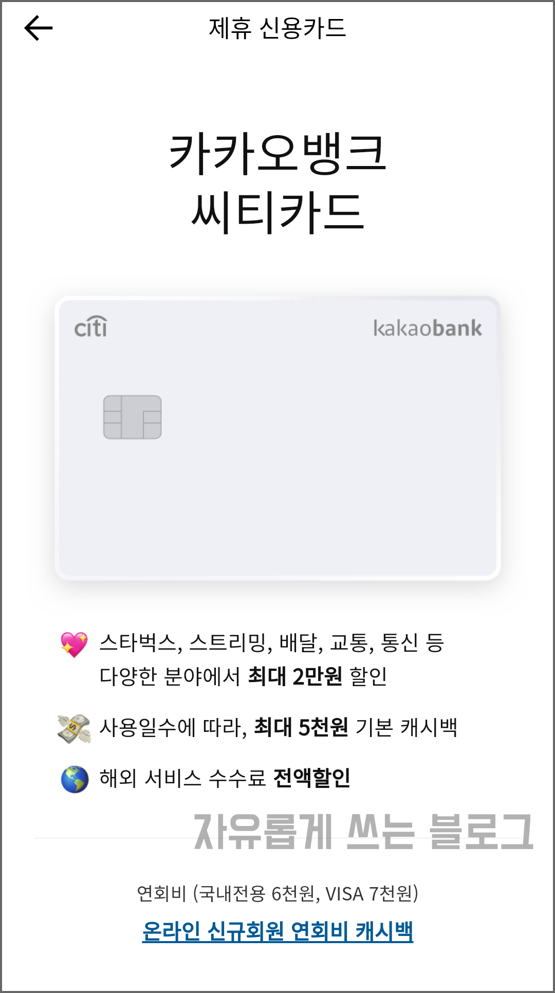 카카오뱅크 씨티카드도 신한카드와 마찬가지로 해외 서비스 수수료 전액 할인 혜택을 제공하네요.^^