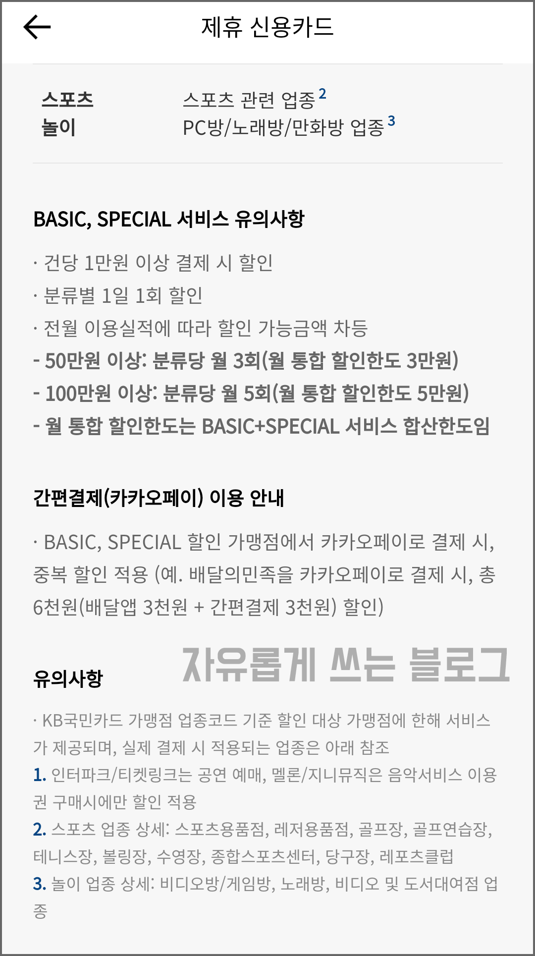 구체적으로 살펴보면, KB국민카드는 베이직 할인 혜택과 스페셜 할인 혜택으로 나뉘어 있고
