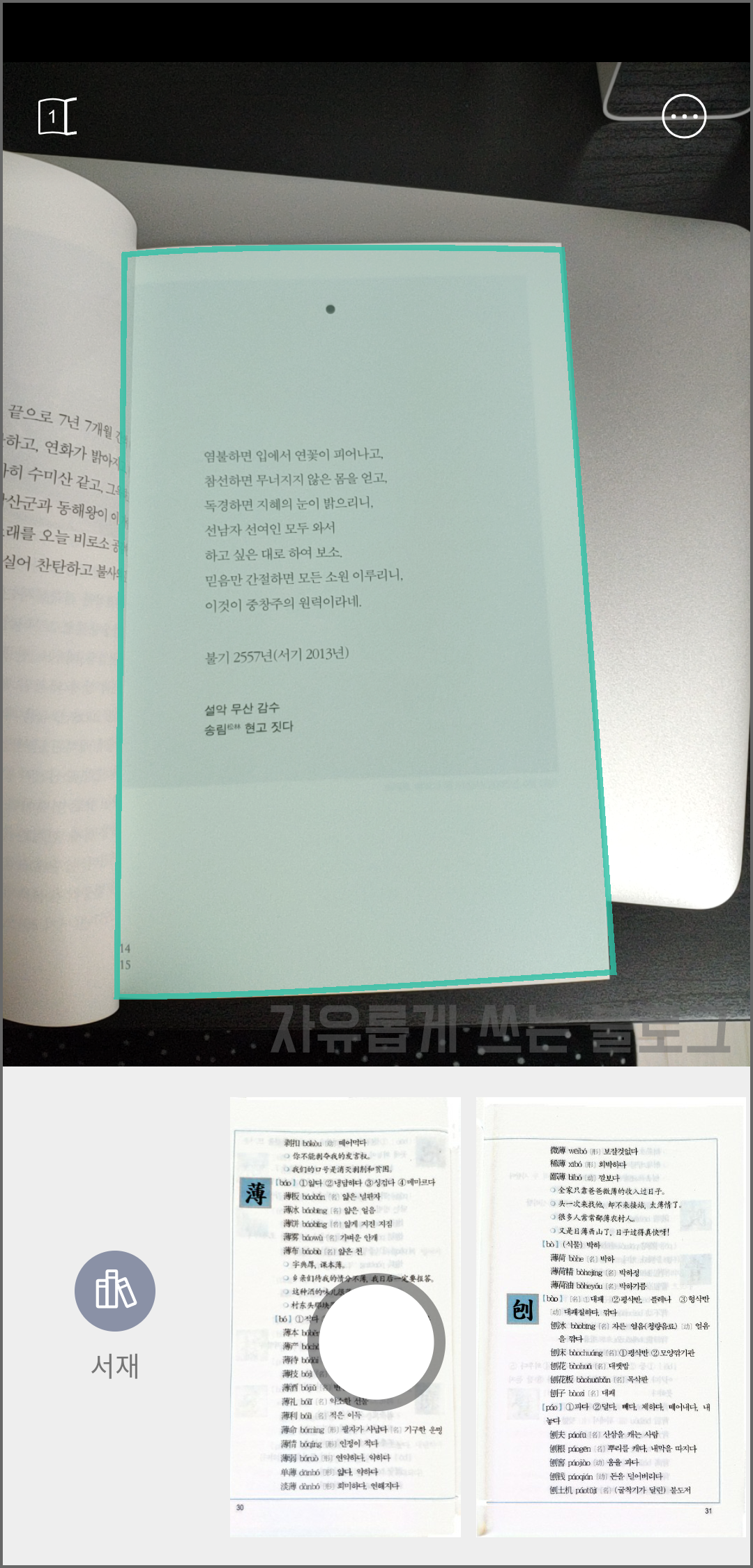 사용법도 무지 간단합니다. 일단 책을 펼쳐놓고 카메라를 가져다 대면 알아서 책이 있는 부분을 인식하는데요,