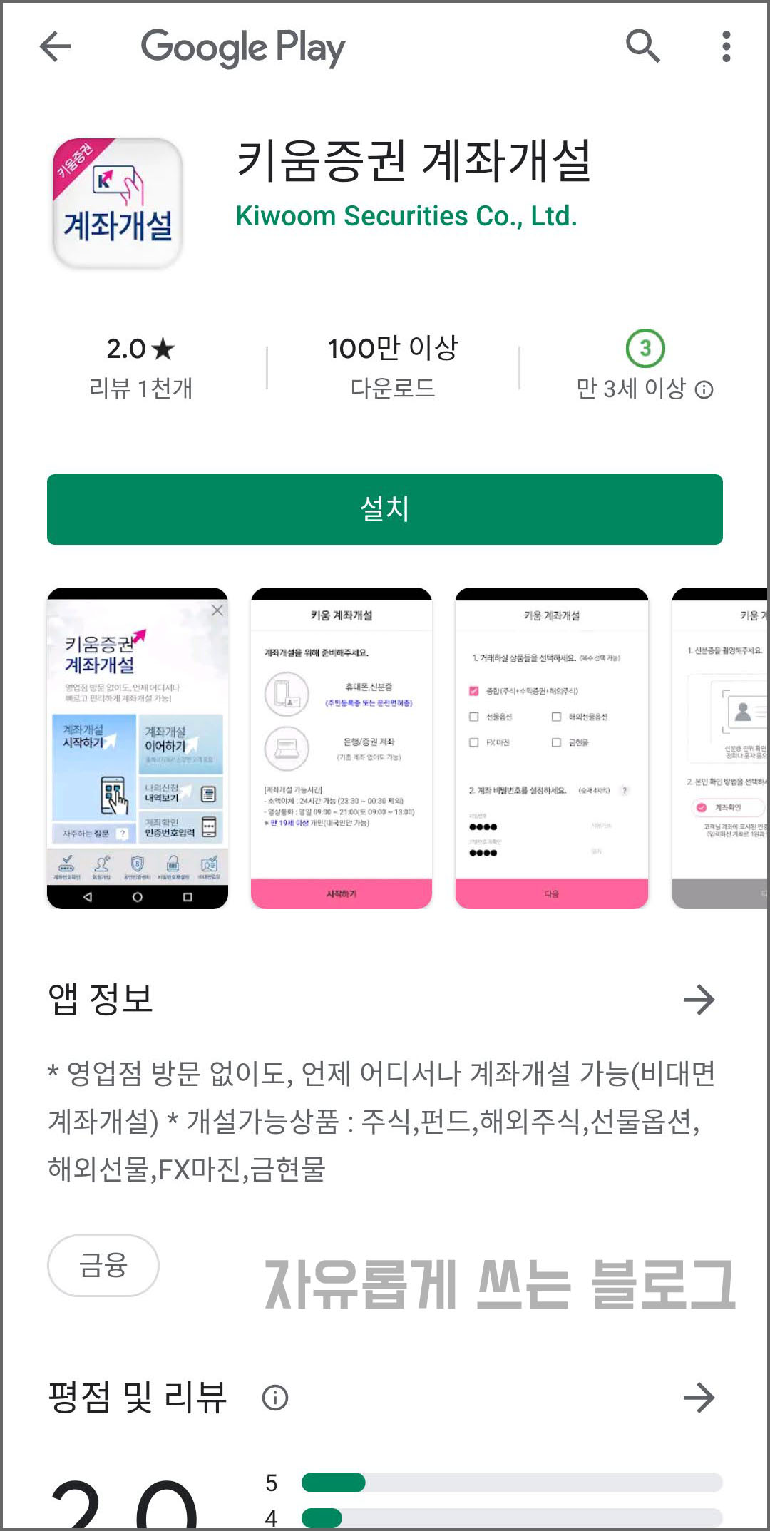 먼저 ‘키움증권 계좌개설’ 앱을 설치해야 하는데요, 플레이스토어에서 ‘키움증권 계좌개설’ 이라고 검색하면 나옵니다.