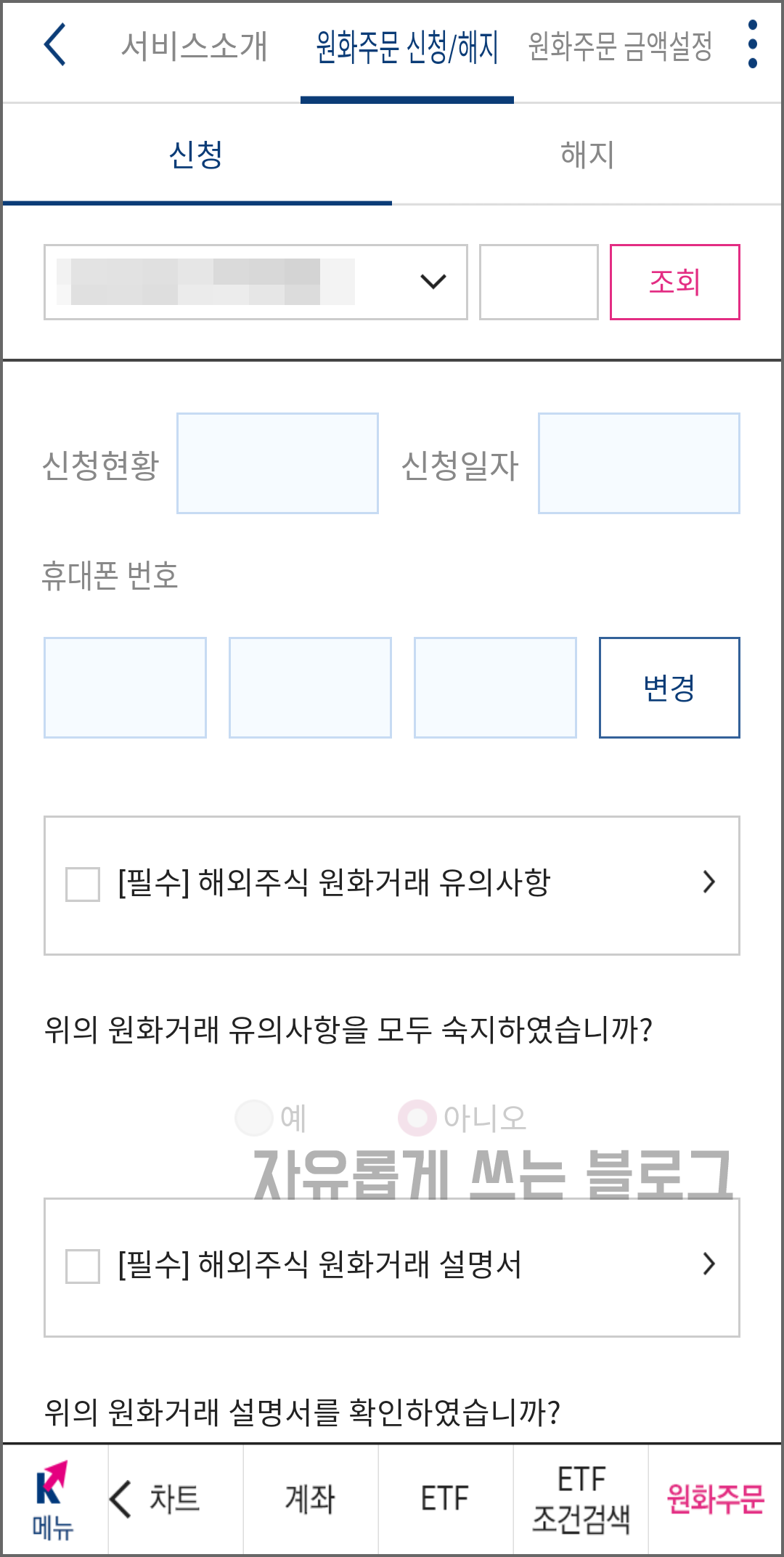 원화주문 신청/해지 화면으로 들어간 뒤