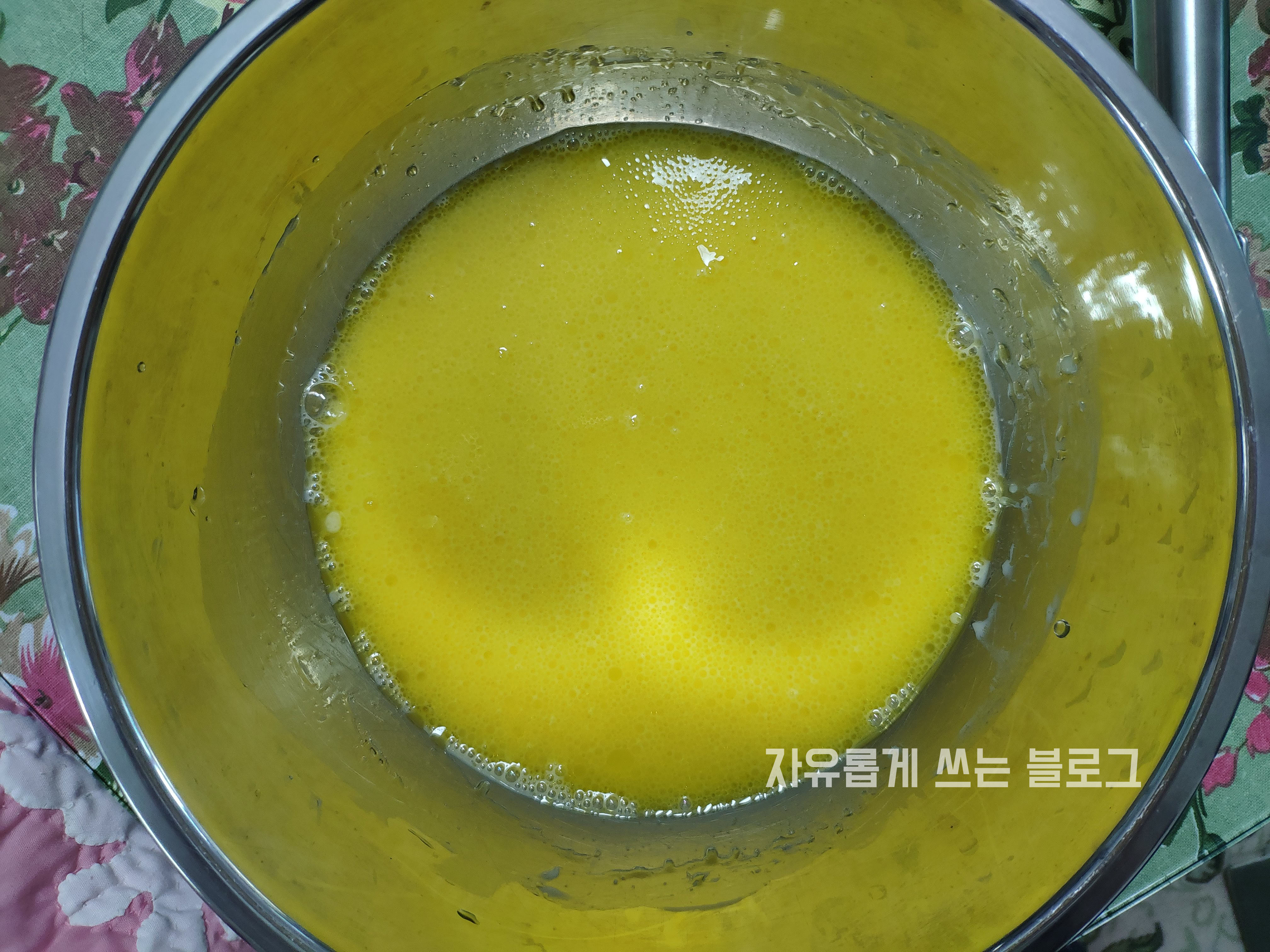 달걀 2개 + 물 반컵 + 아보카도 오일 2큰술을 넣고 잘 저어준 모습이에요.