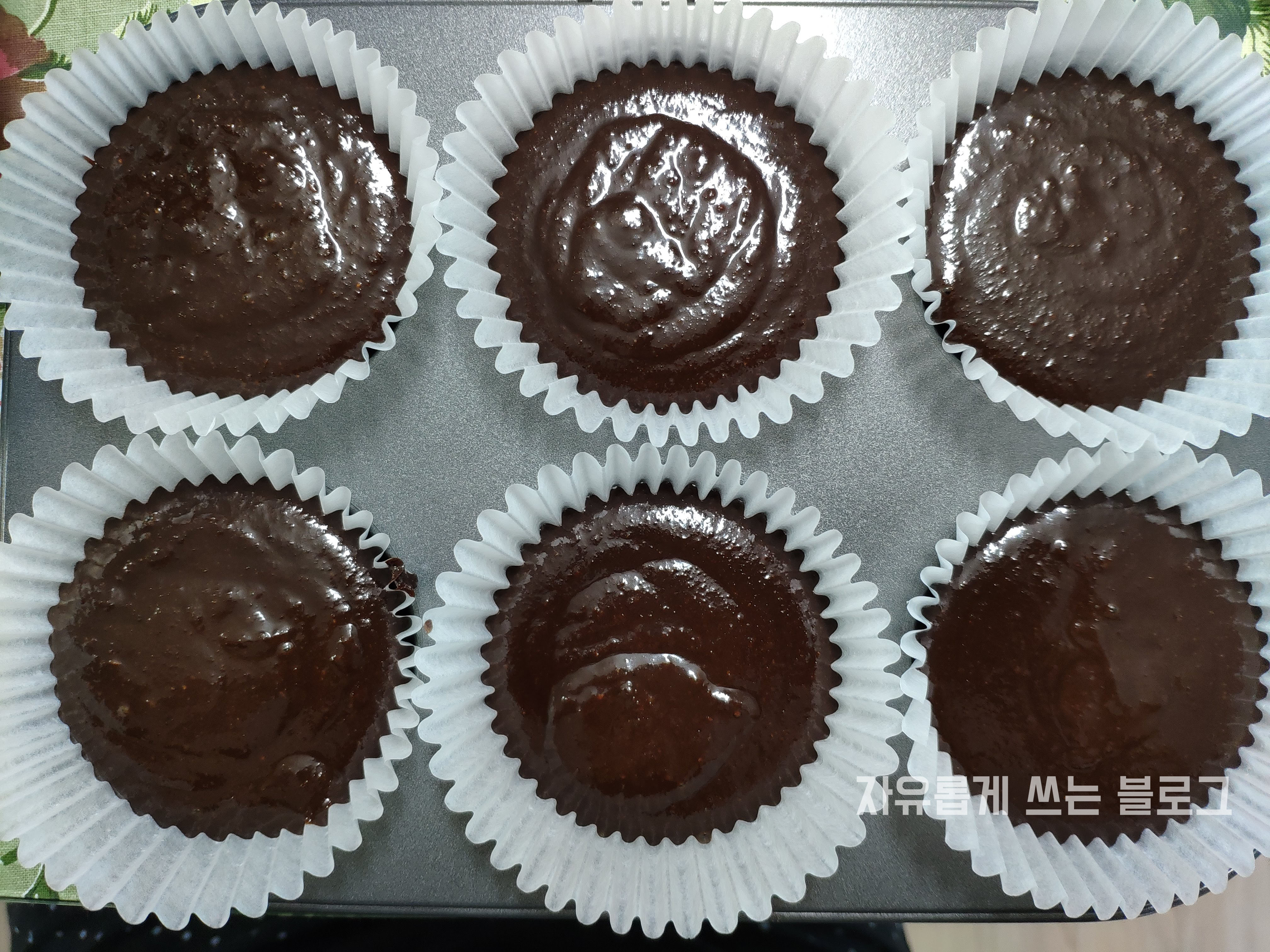 머핀 틀에 유산지를 깔고 완성된 반죽을 넣어주었어요.