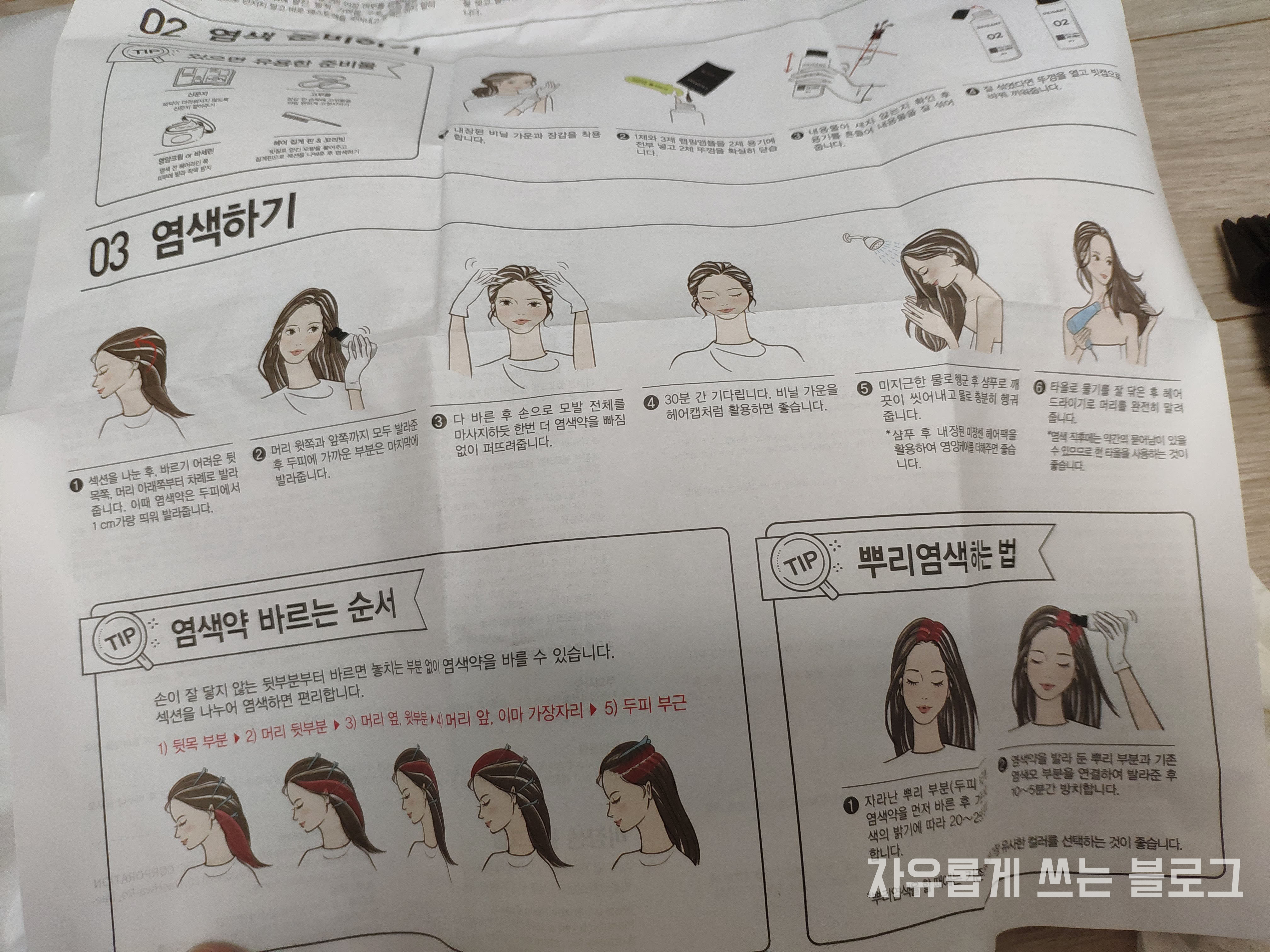 염색약 바르는 순서나 뿌리염색 하는법도 나와있길래 꼼꼼히 한번 읽어 보았습니다.ㅎㅎ