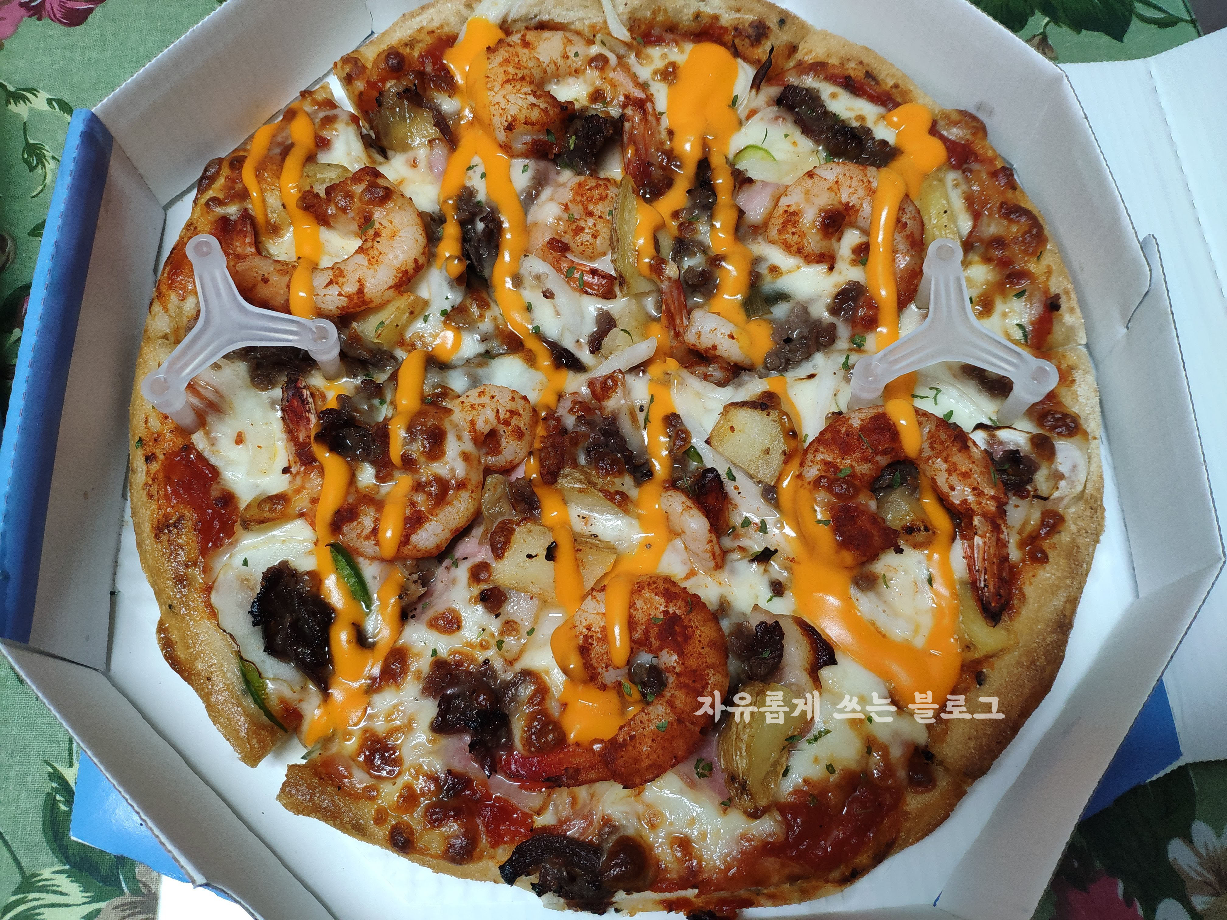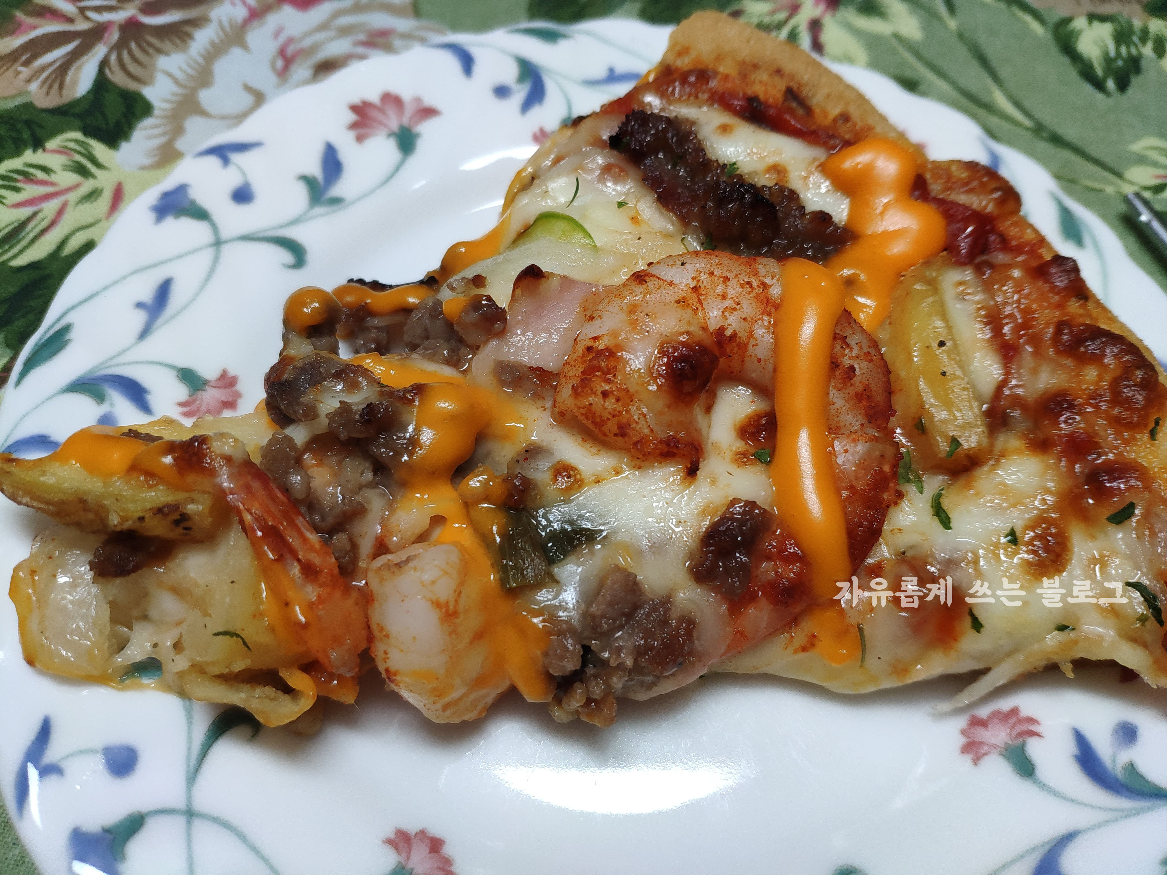 통통한 새우와 불고기를 함께 맛볼 수 있는 피자였어요. :)