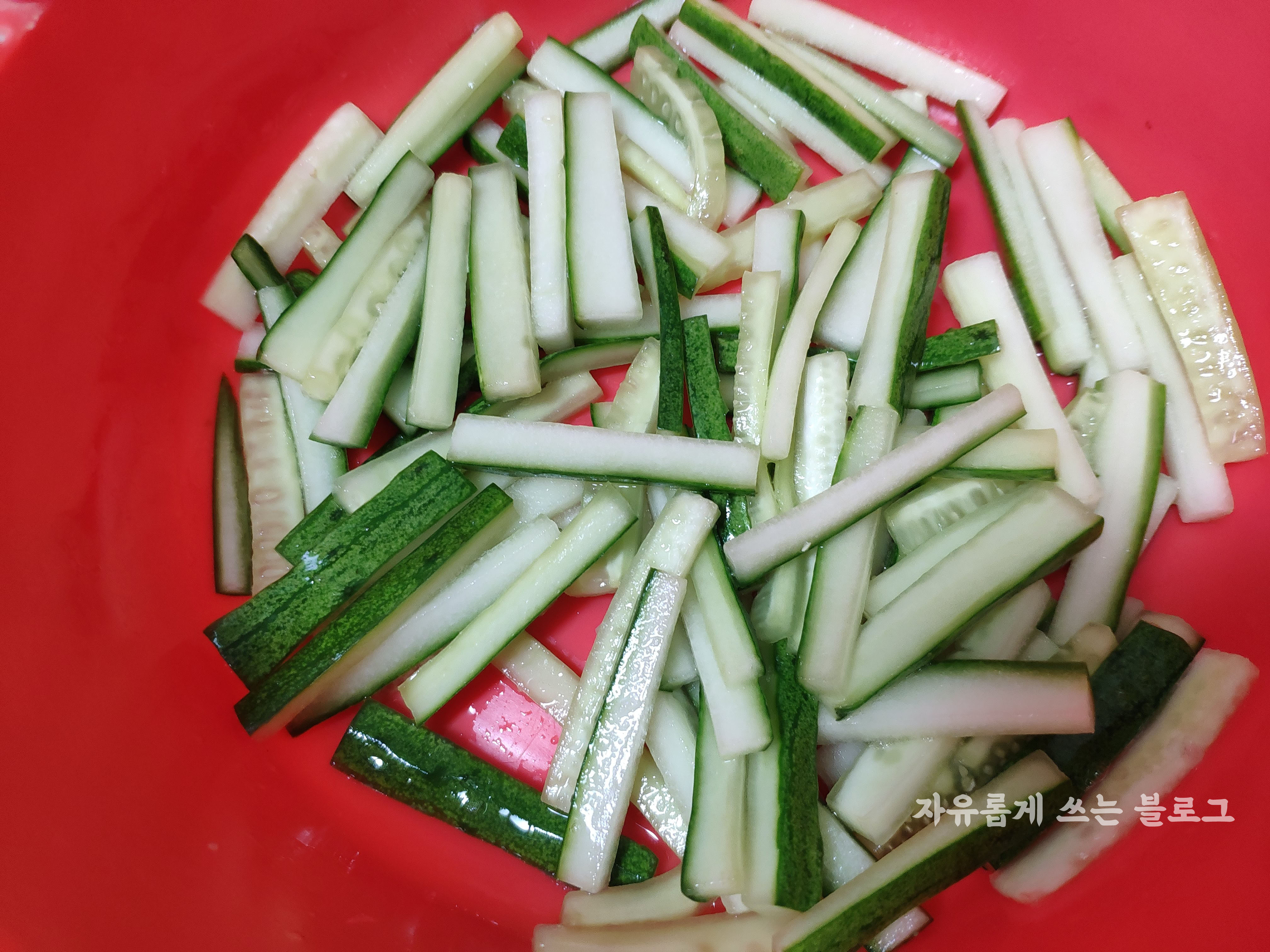 오이도 적당한 크기로 썰어 소금을 넣고 약 10분 정도 절여준 다음,