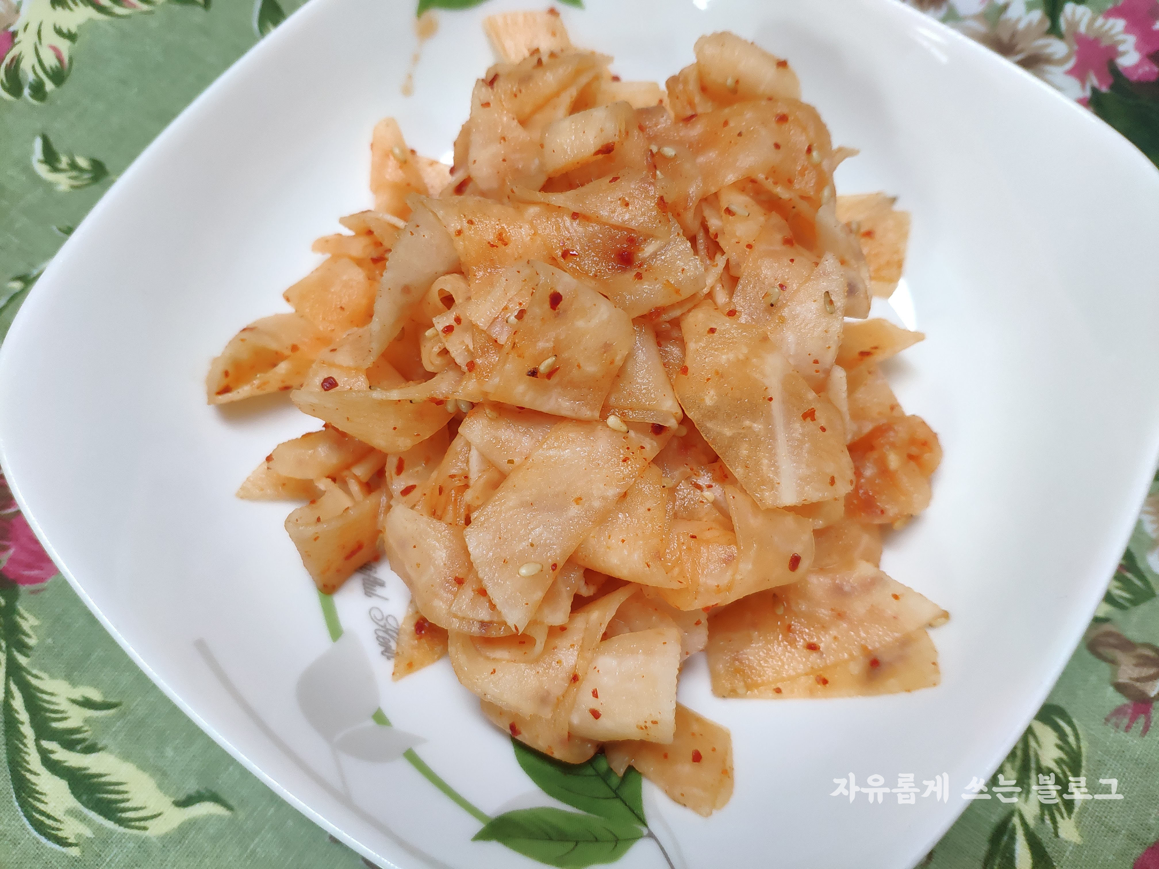 나머지 쌈무는 고춧가루와 통깨를 넣고 버무려주면 함께 곁들여 먹을 반찬이 완성됩니다.^^