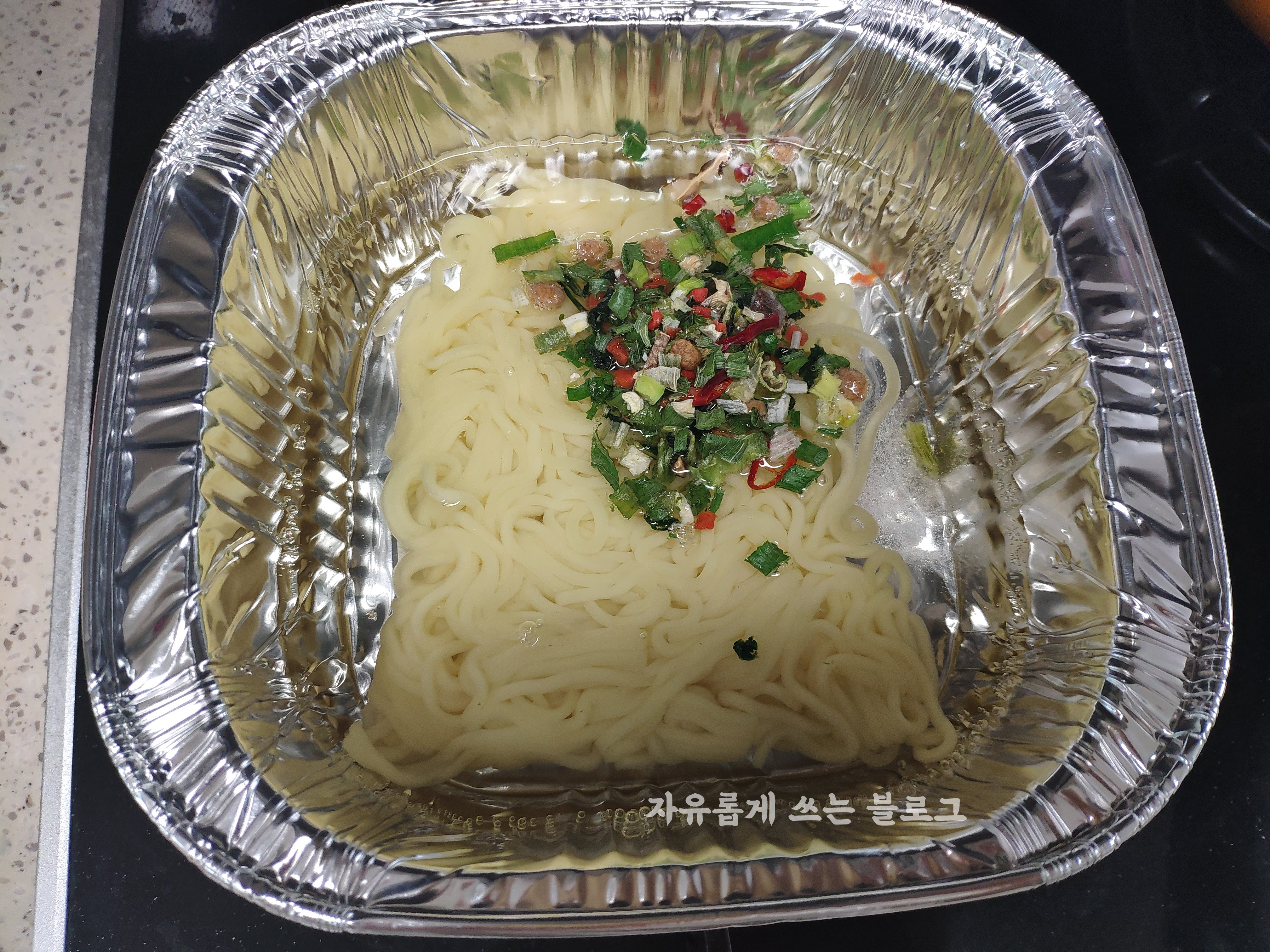 물이 끓는다 싶어 사리면과 건더기 스프를 넣은 뒤 2분간 더 익혀주었습니다.