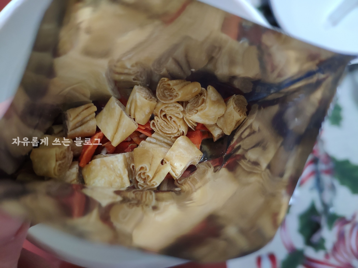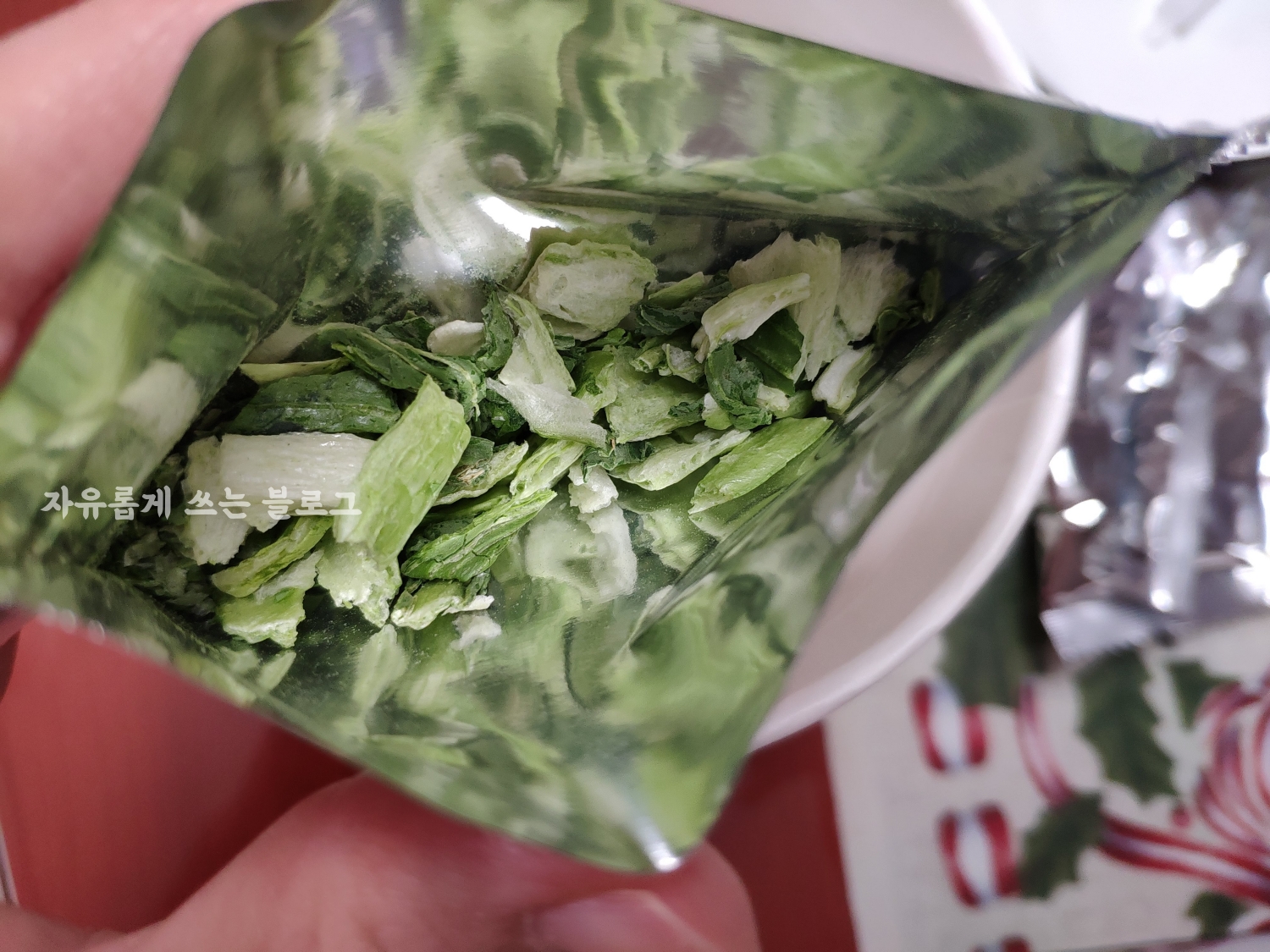 뭔가 하얀 가루(?) 같은 스프와 건조 청경채, 건조된 포두부+당근 으로 구성되어 있더라구요.