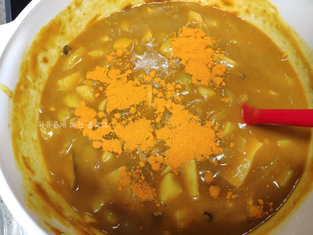 완성된 카레에 아래 사진처럼 강황 가루를 뿌리고 잘 저어준 뒤 섭취했어요.