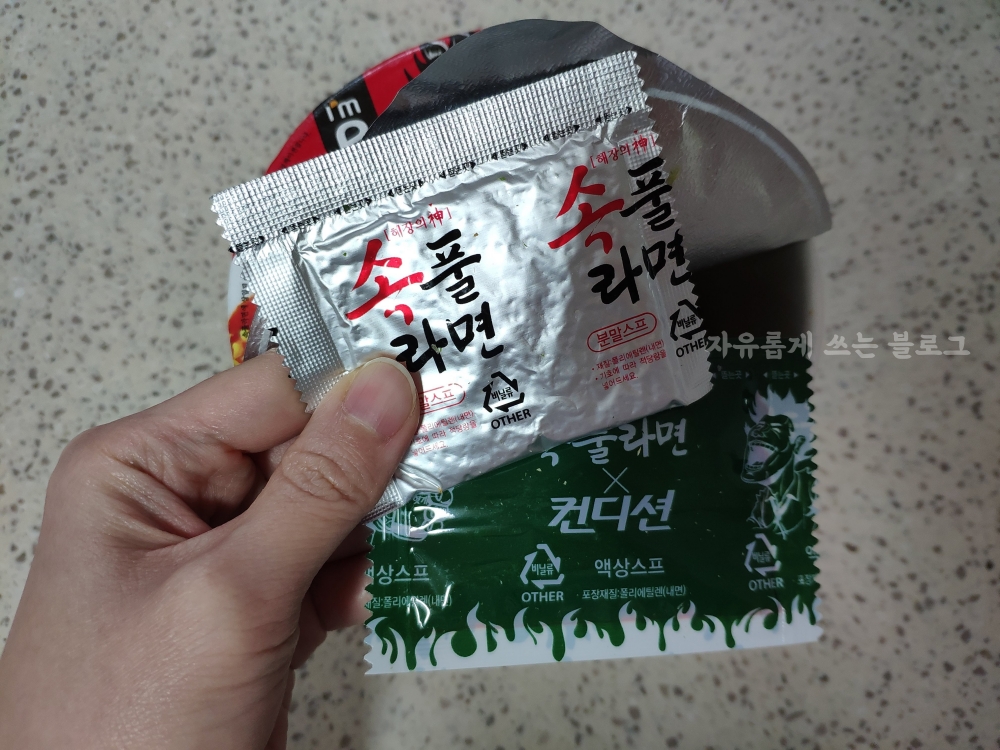 분말스프와 액상 스프를 넣어주었습니다.
