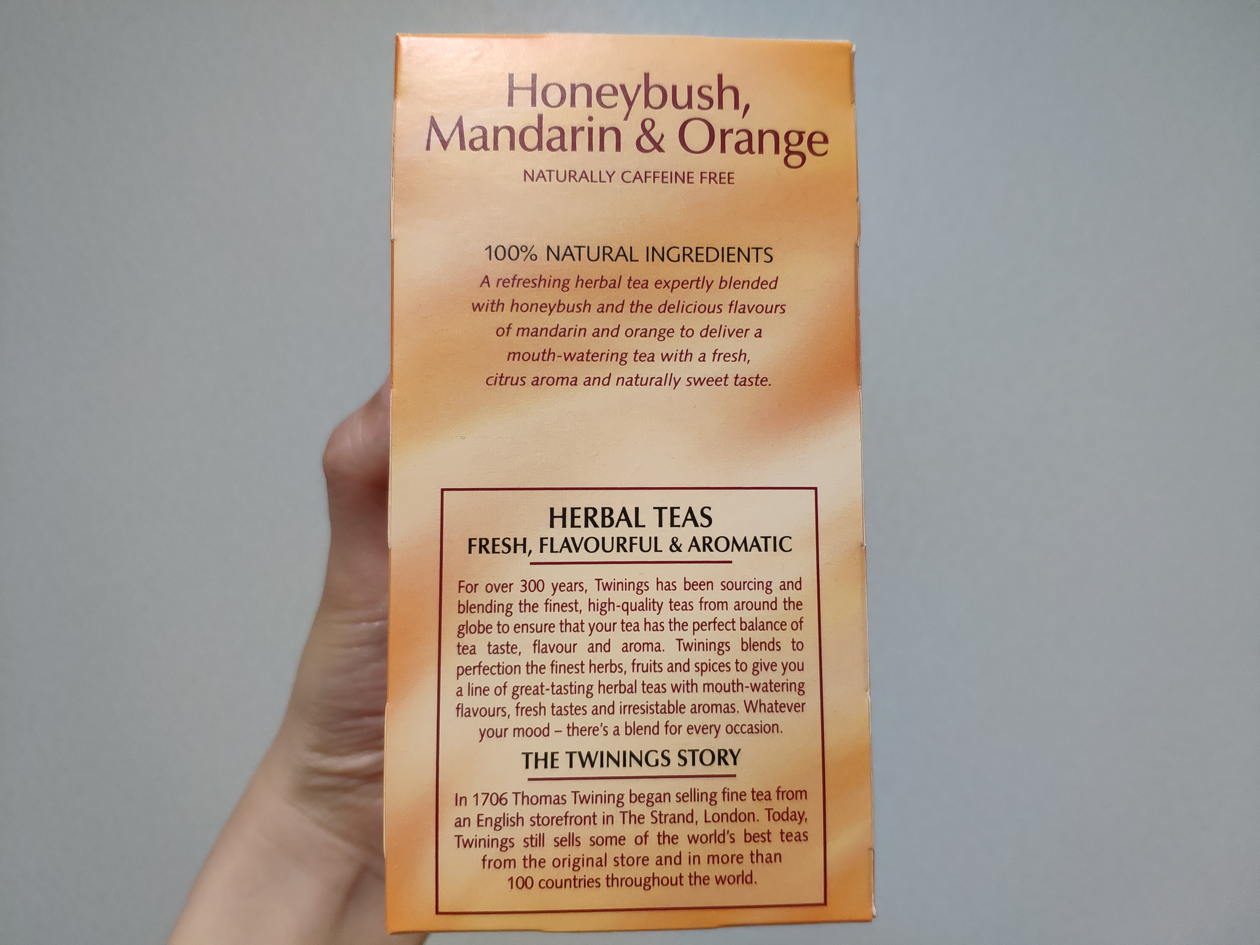 오늘 소개해드릴 아이허브 차 추천제품은 바로 티 브랜드 트와이닝(TWININGS)의 허니부쉬, 만다린 & 오렌지 허브차입니다.