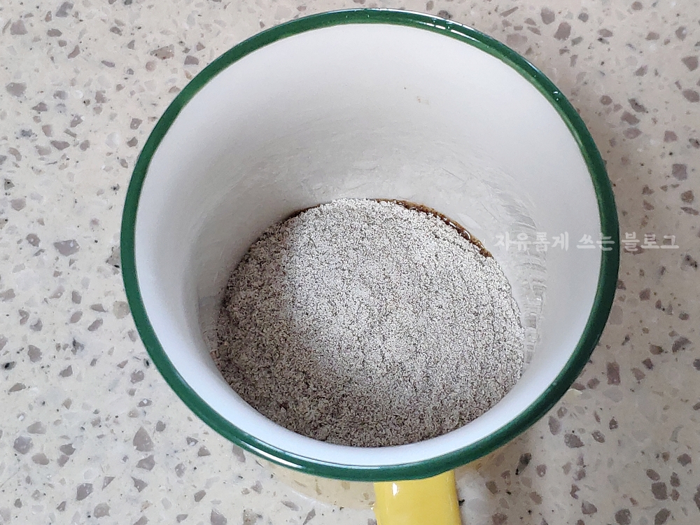 맛을 보기 위해 바닐라라떼 1봉을 머그컵에 부어보았습니다.