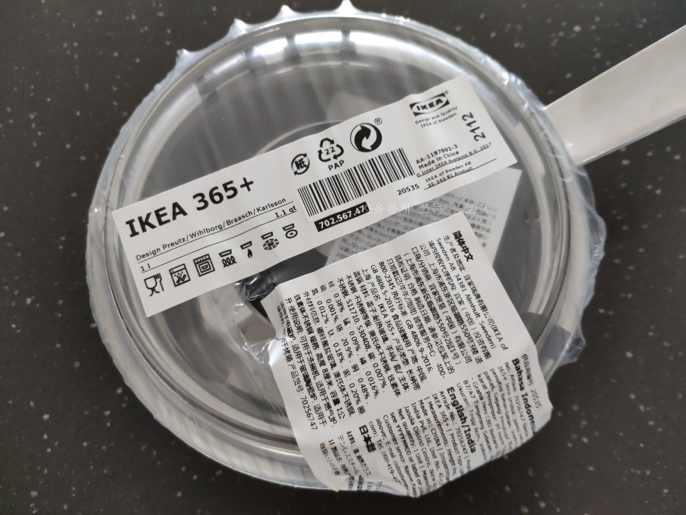 이케아 냄비 포장을 뜯어본 모습이에요. 스테인레스로 된 본체와 내열 유리 뚜껑으로 구성되어 있습니다.