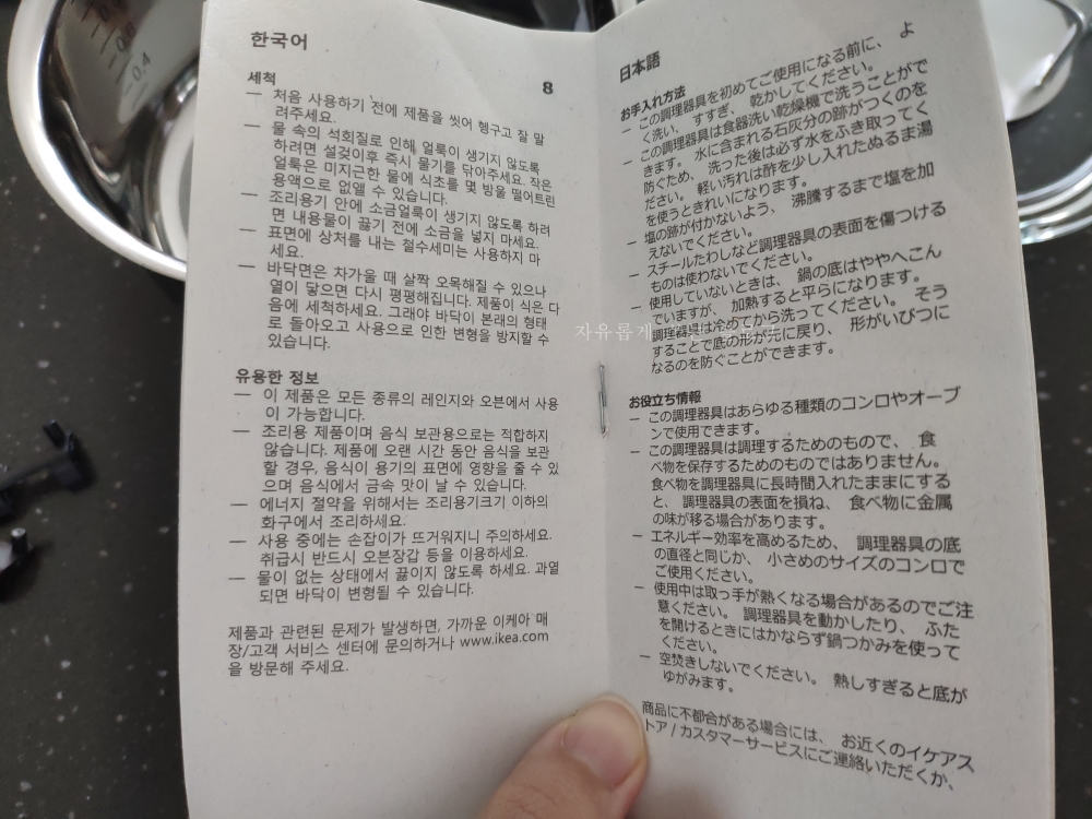 이케아 냄비 포장을 뜯어 보니 안에 설명서 같은 것이 들어 있더라고요. 여러 가지 언어로 되어 있었는데 한국어로도 쓰여 있습니다.ㅎㅎ