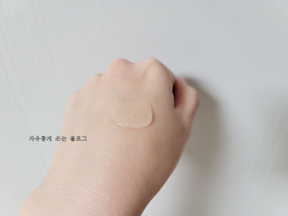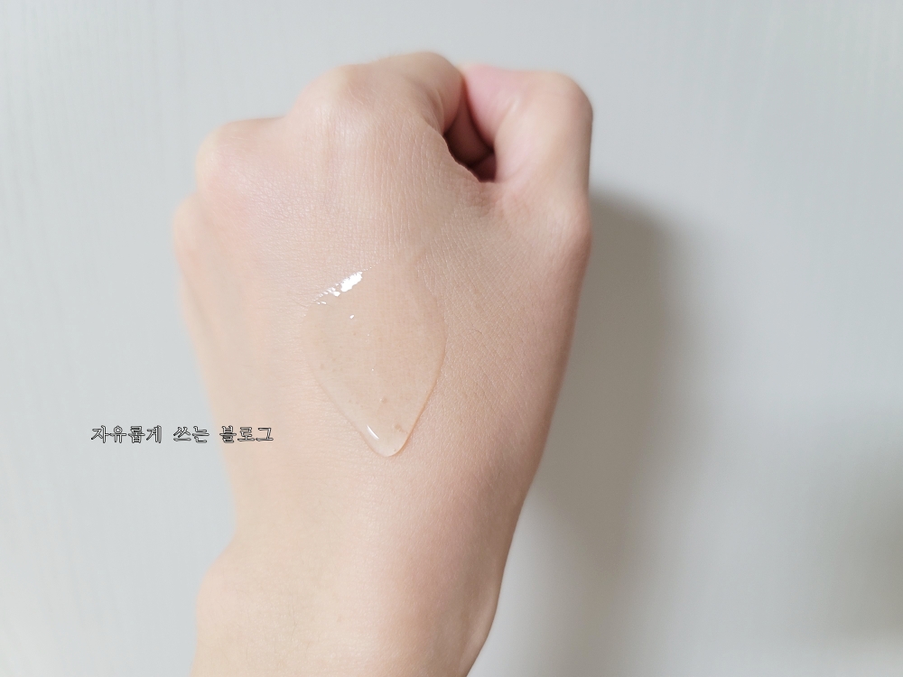 손등에 살짝 덜어본 모습. 무색 투명하면서 약간 꾸덕한? 제형이에요.