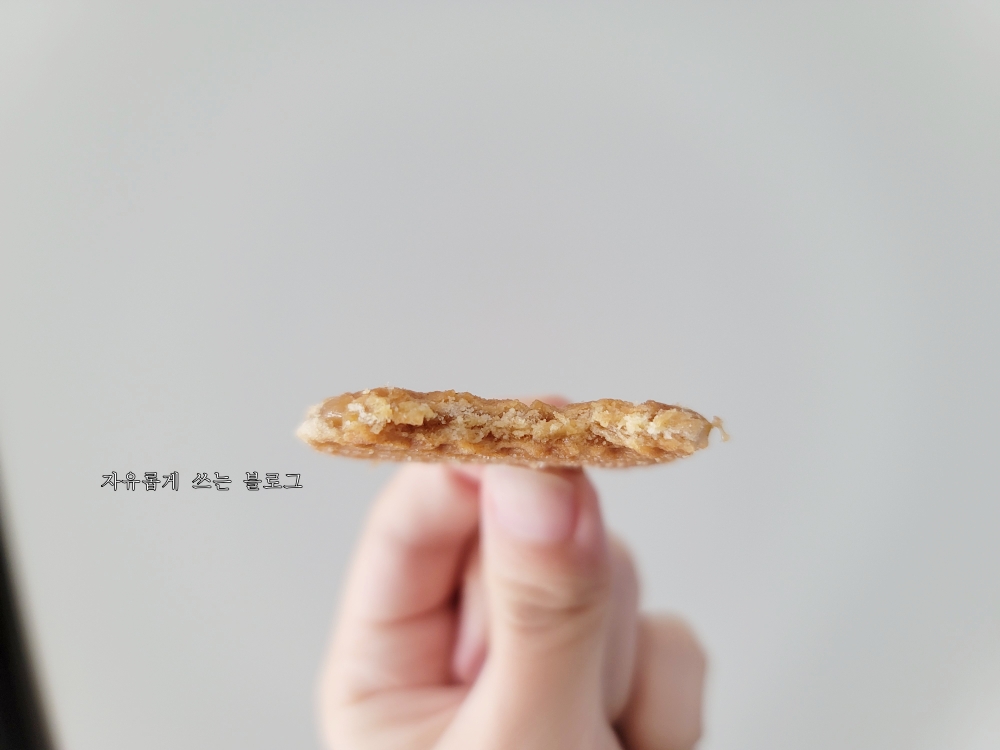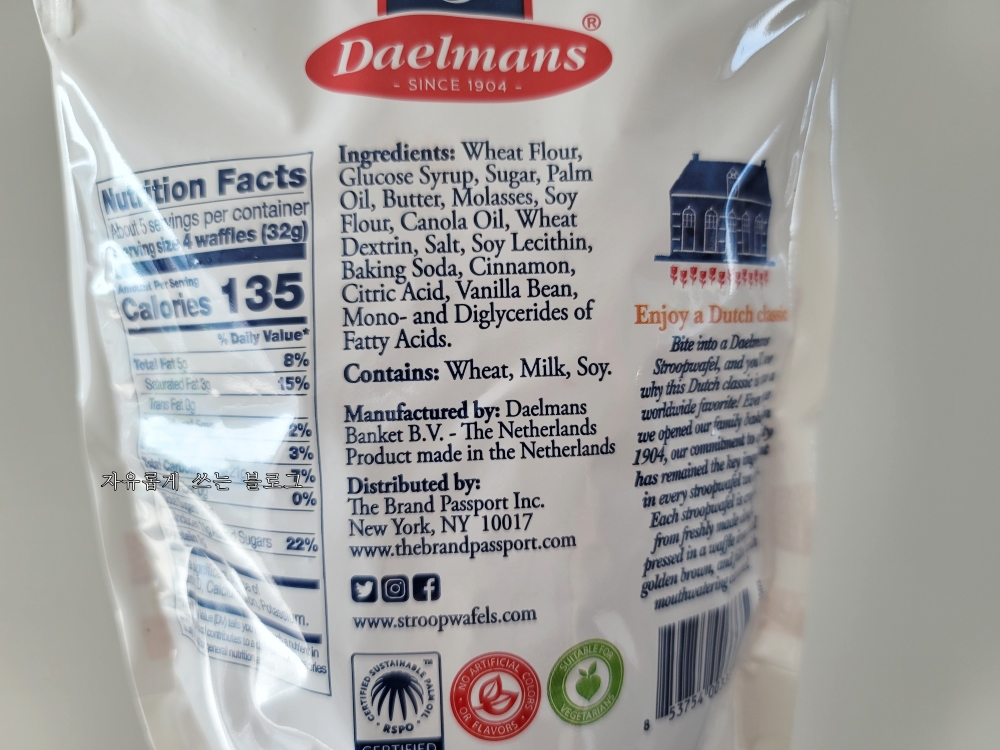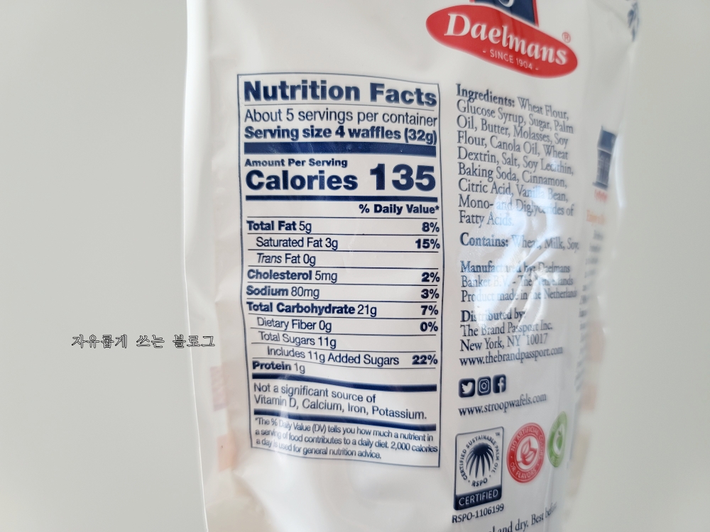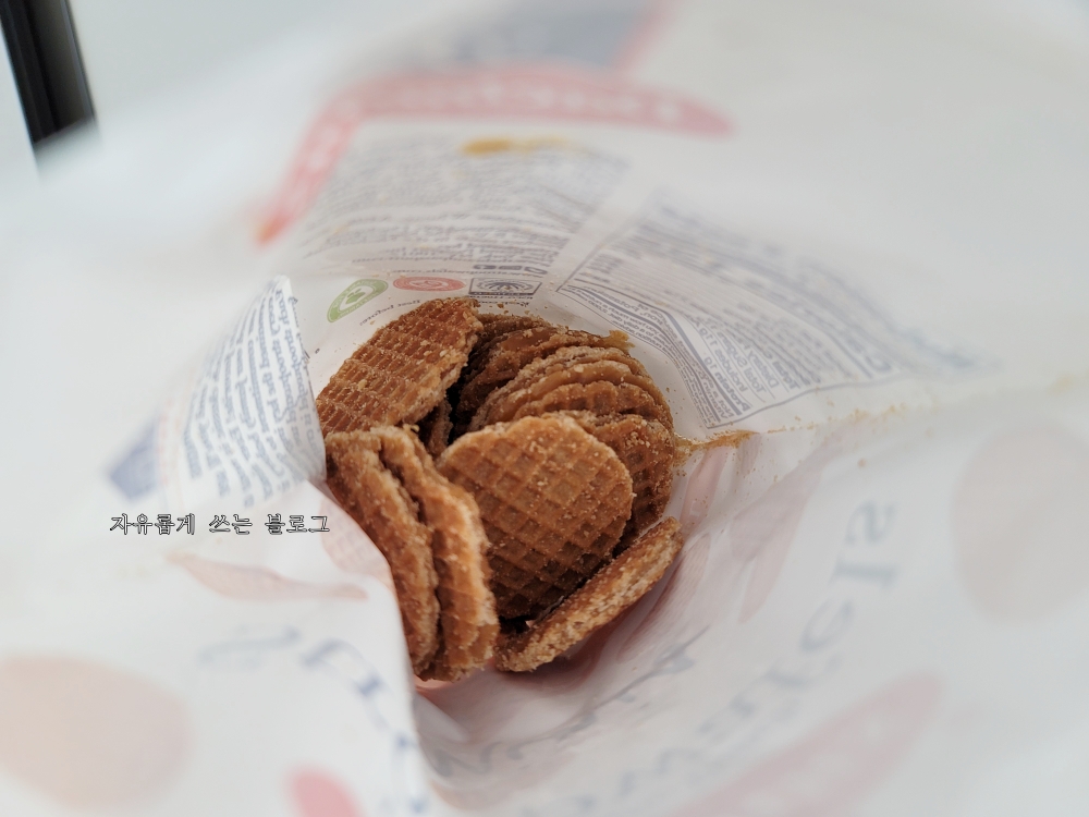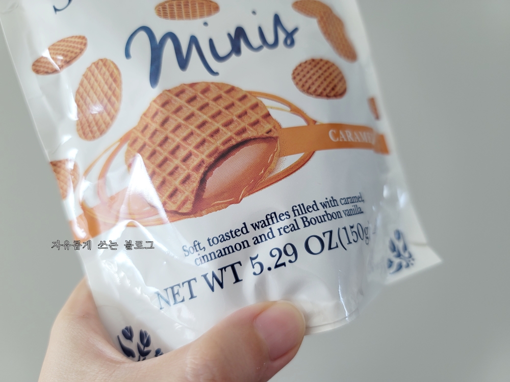 한 봉지당 양은 150g입니다. 와플 사이의 시럽에는 카라멜, 시나몬, 그리고 부르봉 바닐라가 들어 있다고 합니다.
