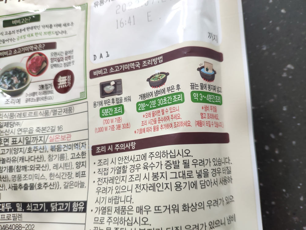 원재료명을 보면 정제수, 소고기 볶음, 건 미역, 카놀라유, 양지 국물, 농축액 등이 들어갔다고 합니다.