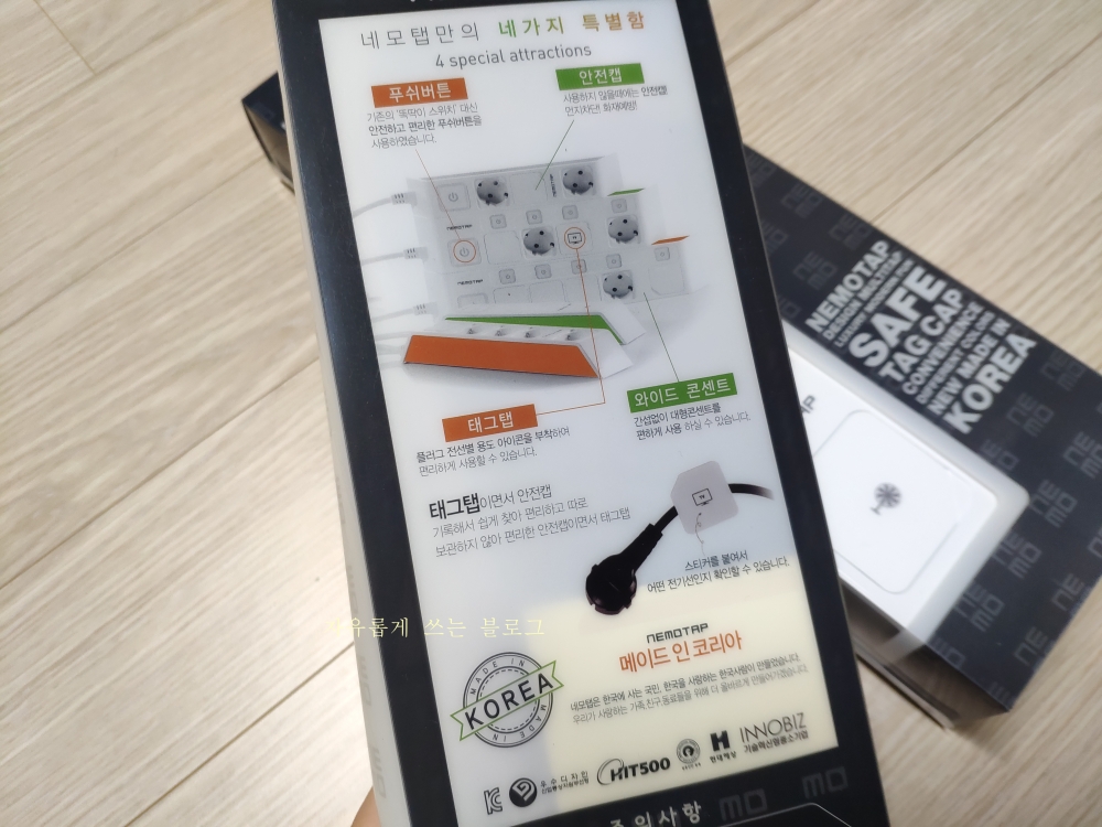 뒷면에는 네모탭의 특징에 대해 설명이 되어 있습니다. '메이드 인 코리아'라고 큼직하게 쓰여 있네요. 뭔가 믿음직스러운 느낌!ㅋㅋ