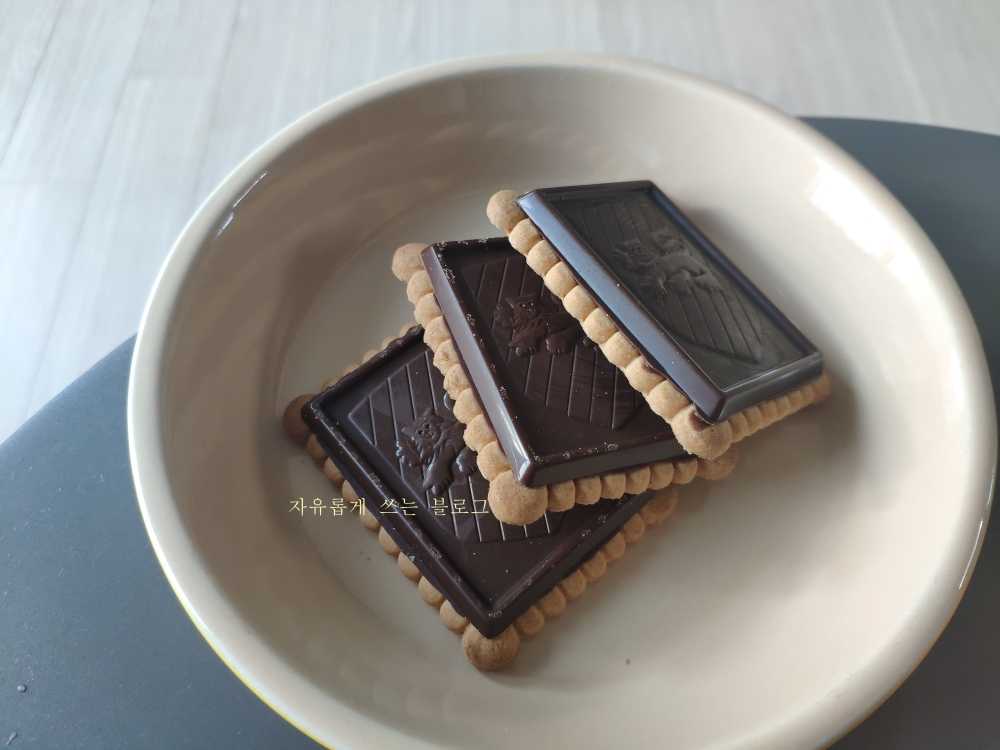 얇은 비스킷에 네모난 모양의 초콜릿이 붙어있는 비주얼이에요.