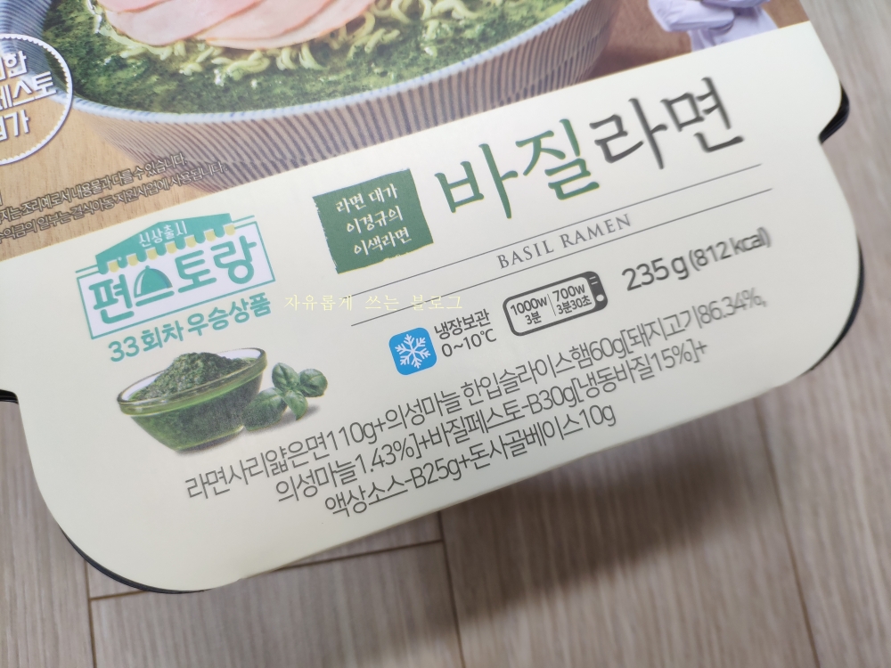 편스토랑 바질라면은 냉장보관해야 하는 제품이고, 전자렌지에 돌려 조리해 먹게끔 되어 있습니다.